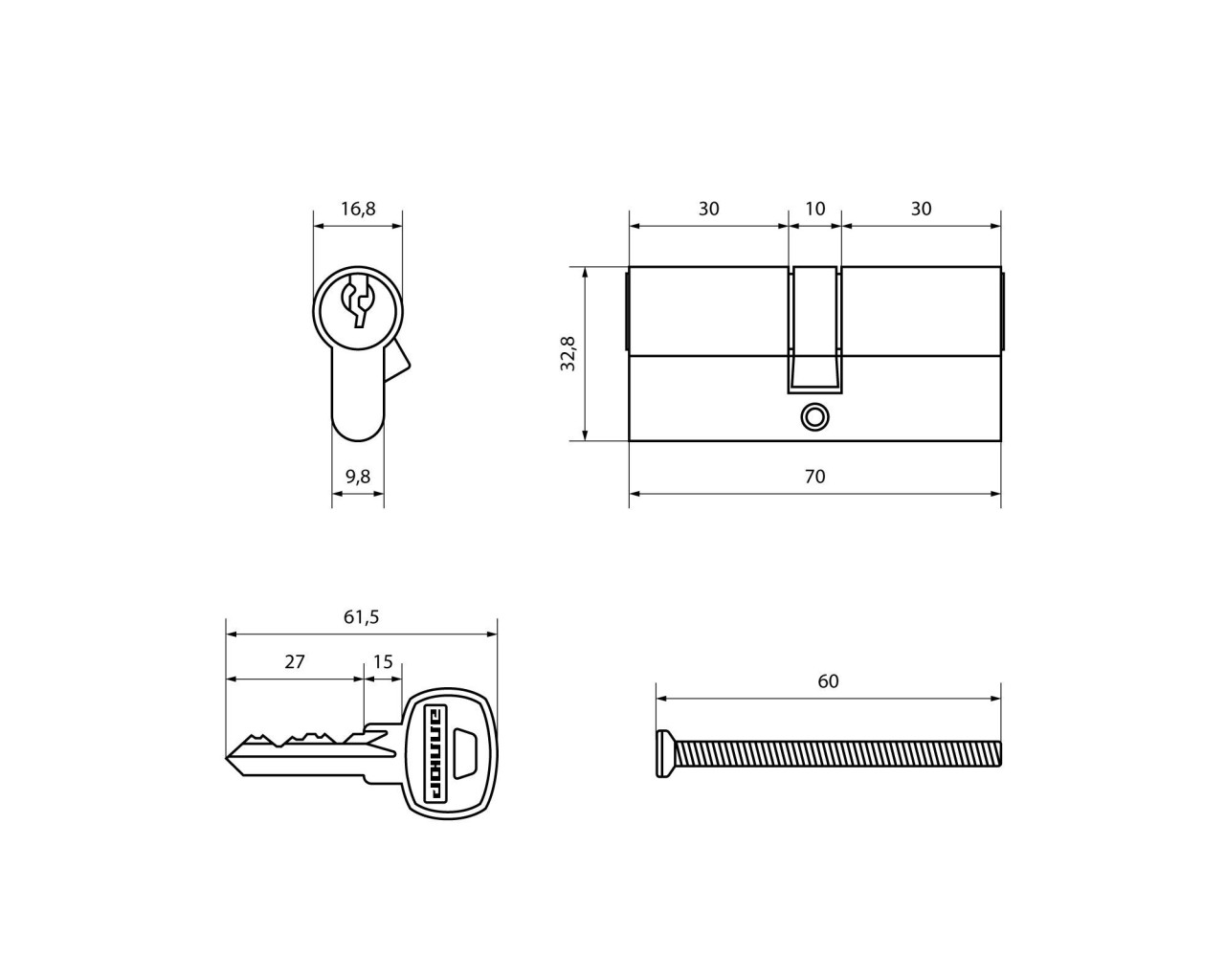 Механизм цилиндровый для врезных замков под один ключ. Европрофиль. Английский ключ. Материал корпуса и ключей – латунь. Механизм защищен стержнем от высверливания. Выступающий на 30 градусов из плоскости механизма кулачок защищает цилиндр от выбивания из двери. Длина механизма - 70 мм (30х10х30). ПРИ УСТАНОВКЕ НЕ ИСПОЛЬЗОВАТЬ ЭЛЕКТРО ИНСТРУМЕНТ!