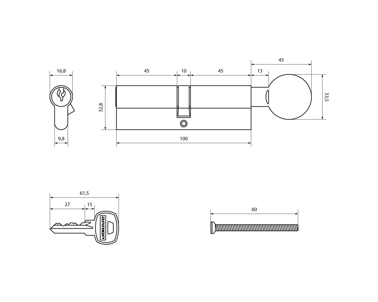 Механизм цилиндровый для врезных замков. Европрофиль. Английский ключ. Материал корпуса и ключей – латунь. Ключ-вертушка. Механизм защищен стержнем от высверливания. Выступающий на 30 градусов из плоскости механизма кулачок защищает цилиндр от выбивания из двери. Длина механизма - 100 мм (45х10х45). ПРИ УСТАНОВКЕ НЕ ИСПОЛЬЗОВАТЬ ЭЛЕКТРО ИНСТРУМЕНТ!