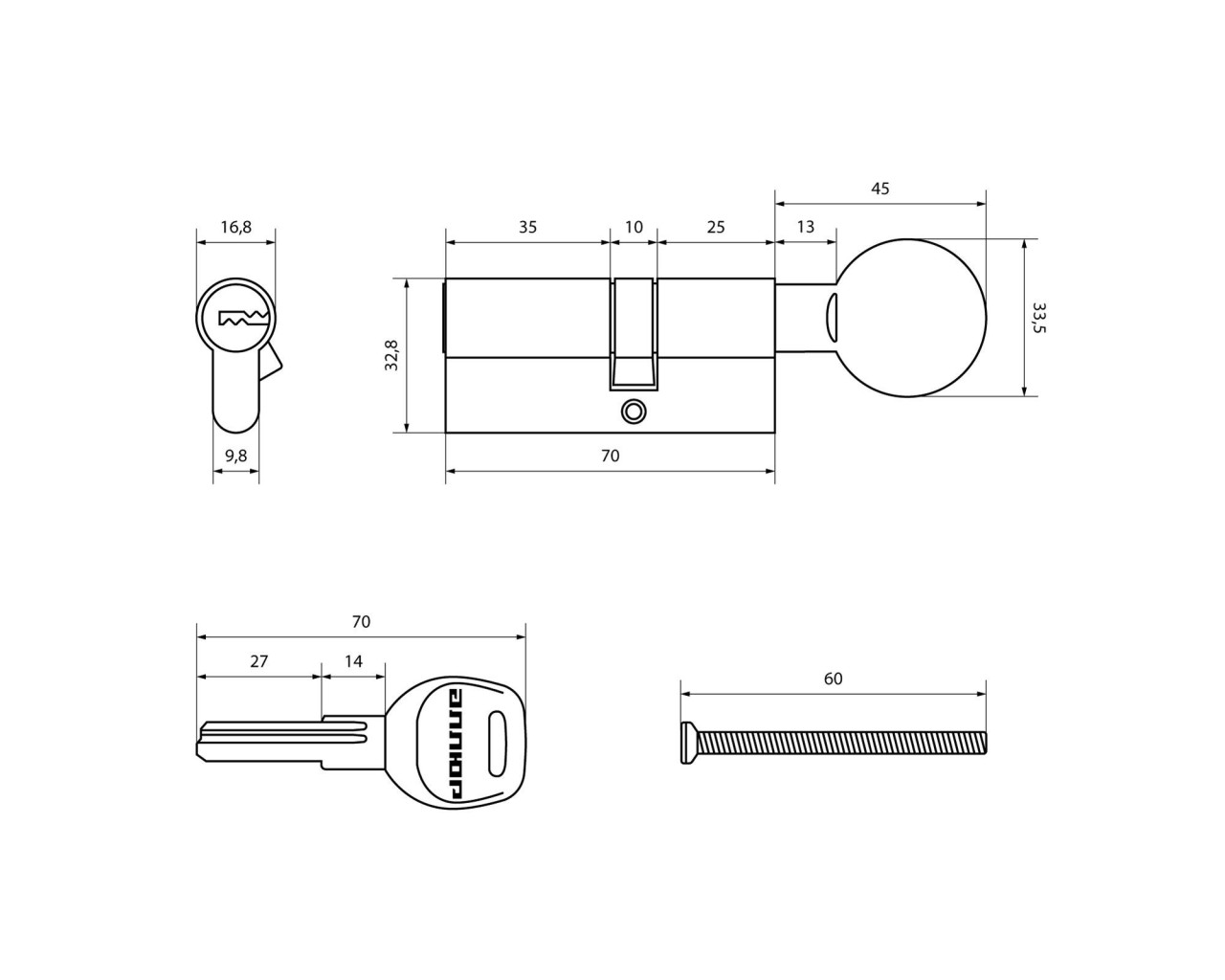 Механизм цилиндровый для врезных замков с 6 пинами секретности. Европрофиль. Перфо-ключ. Материал корпуса и ротора – латунь. Ключ-латунный, с эргономичной пластиковой головкой. Ключ-вертушка. Длина механизма - 70 мм (25вертушка х10х35). 45000 секретных комбинаций ключа. Механизм защищен от высверливания, вскрытия бампингом и отмычками. Выступающий на 30 градусов из плоскости механизма кулачок защищает цилиндр от выбивания из двери. ПРИ УСТАНОВКЕ НЕ ИСПОЛЬЗОВАТЬ ЭЛЕКТРО ИНСТРУМЕНТ!