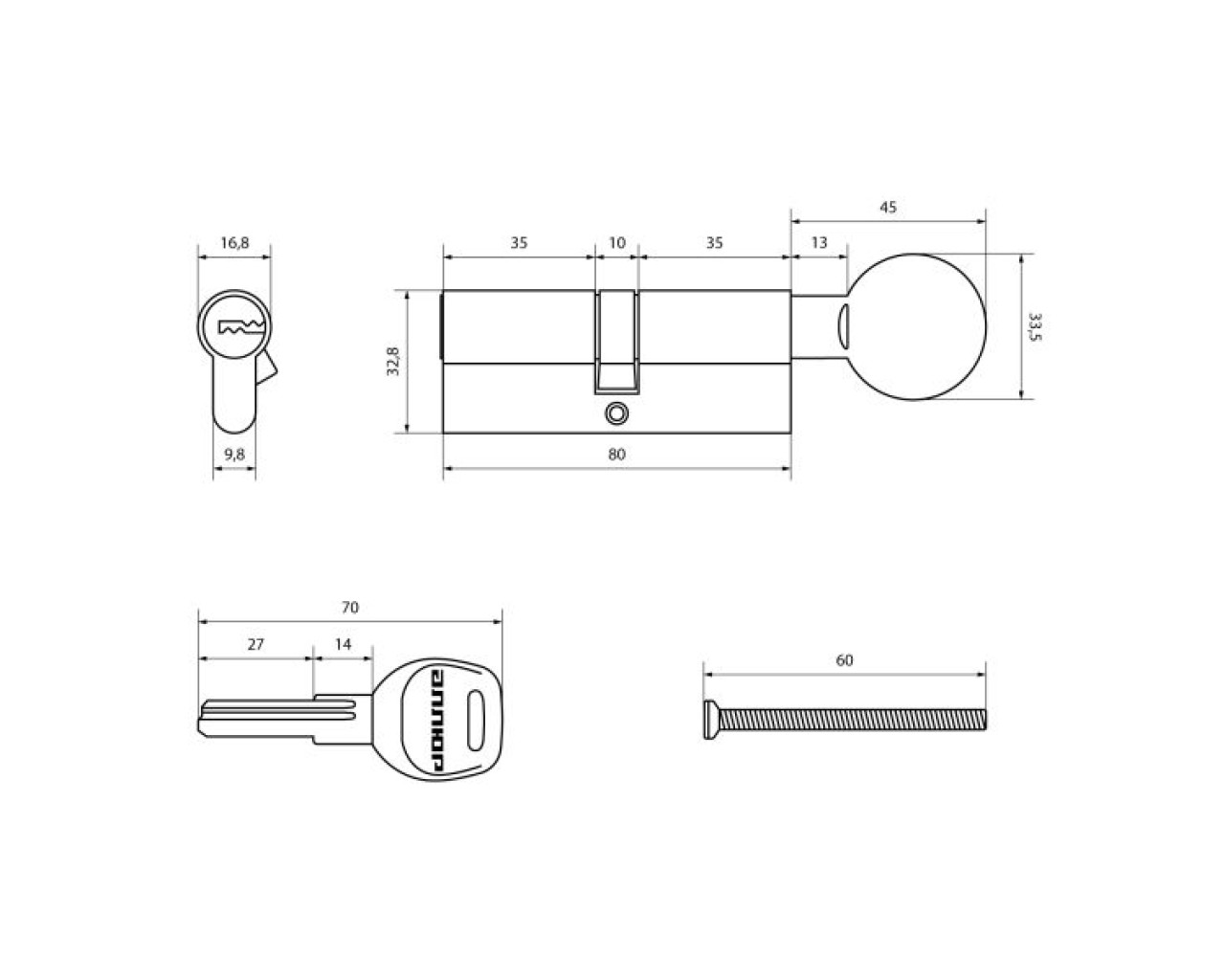 Механизм цилиндровый для врезных замков с 7 пинами секретности. Европрофиль. Перфо-ключ. Материал корпуса – латунь. Ключ-латунный, с эргономичной пластиковой головкой. Ключ-вертушка. Длина механизма - 80 мм (35вертх10х35). 45000 секретных комбинаций ключа. Механизм защищен от высверливания, вскрытия бампингом и отмычками. Выступающий на 30 градусов из плоскости механизма кулачок защищает цилиндр от выбивания из двери. ПРИ УСТАНОВКЕ НЕ ИСПОЛЬЗОВАТЬ ЭЛЕКТРО ИНСТРУМЕНТ!