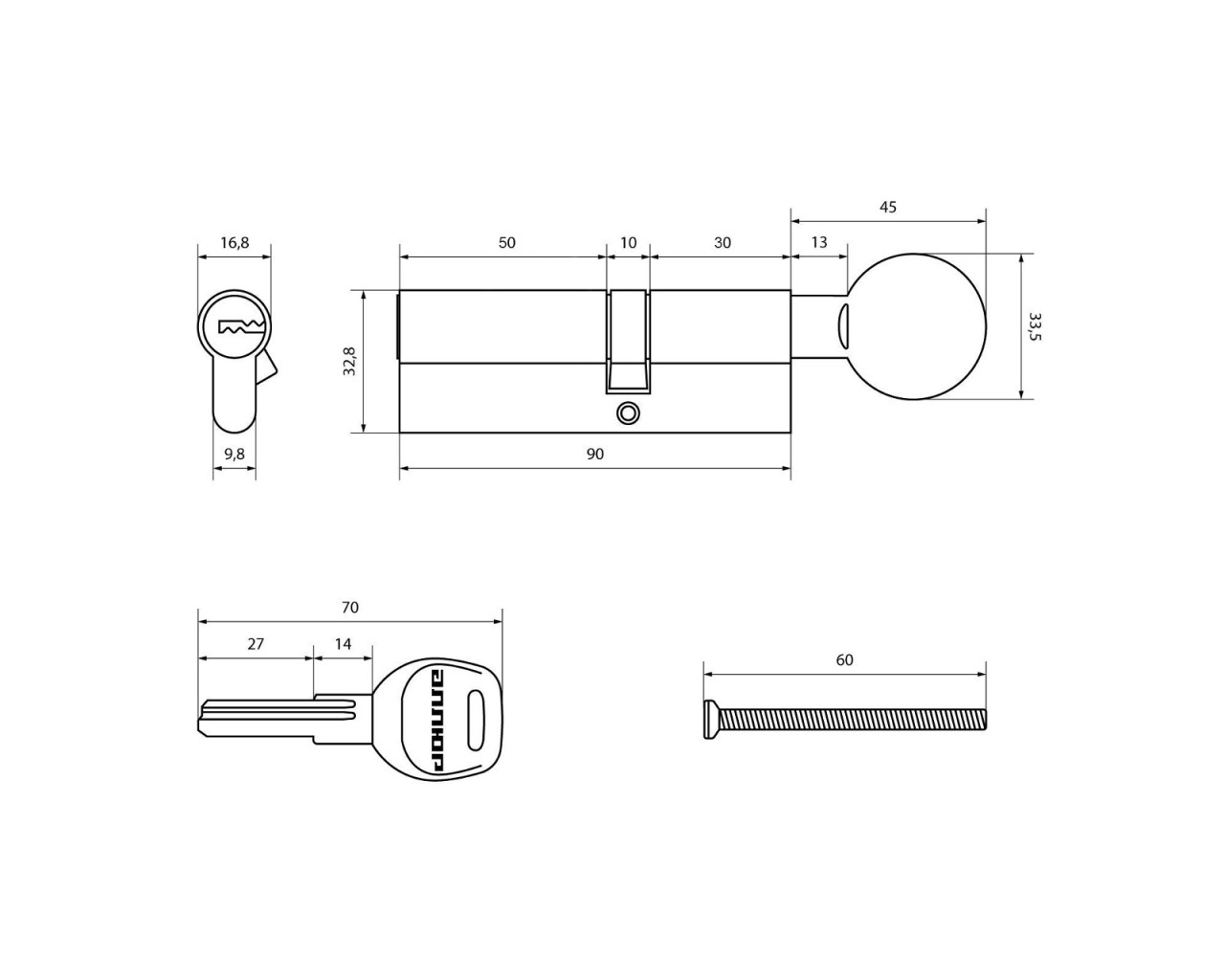 Механизм цилиндровый для врезных замков с 7 пинами секретности Европрофиль Перфо-ключ Материал корпуса латунь Ключ-латунный с эргономичной пластиковой головкой Ключ-вертушка Длина механизма - 90 мм (30вертушка х10х50) 45000 секретных комбинаций ключа Механизм защищен от высверливания вскрытия бампингом и отмычками Выступающий на 30 градусов из плоскости механизма кулачок защищает цилиндр от выбивания из двери