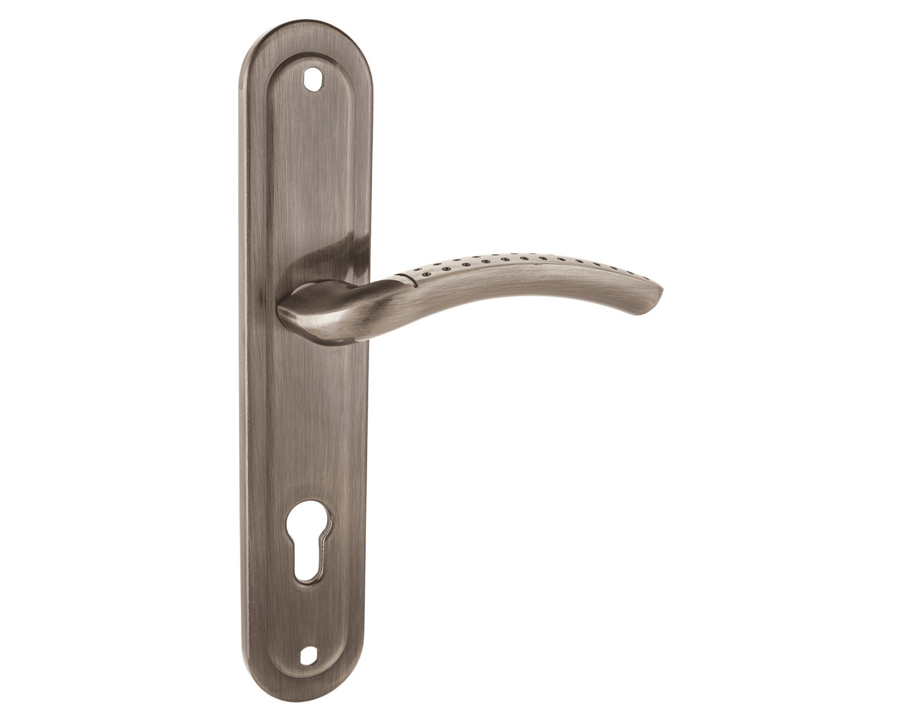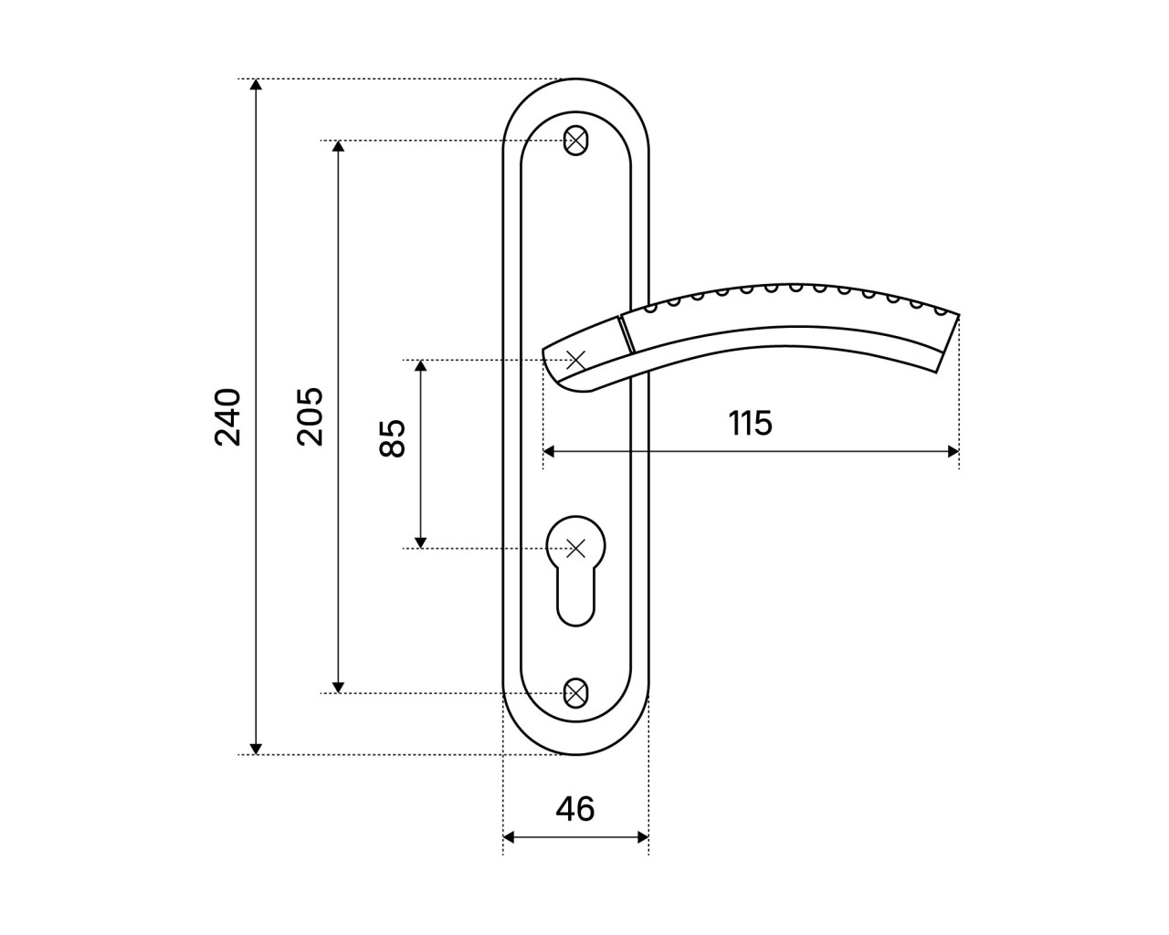 Ручка на планке под замок и цилиндровый механизм Материал - алюминиевый сплав гальваническое покрытие Межосевое расстояние - 85 мм размеры планки - 45 х 235 мм длина ручки - 120 мм В комплект входят винтовые стяжки и квадратный штырь 8х8 мм 105 мм Для дверей толщиной 35-45 мм