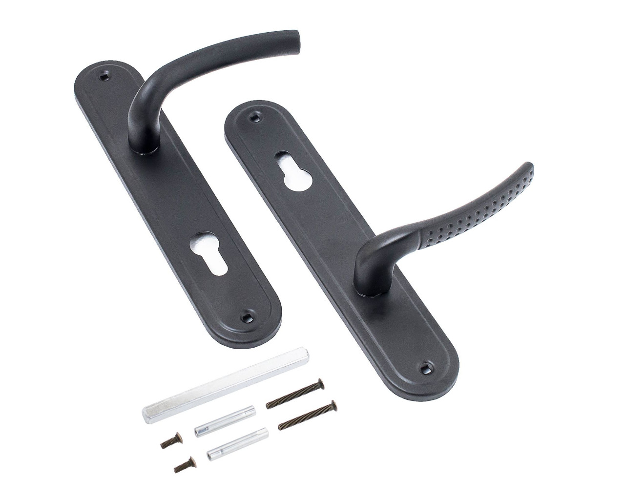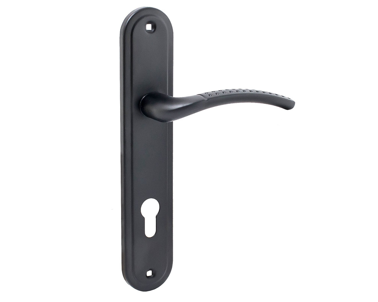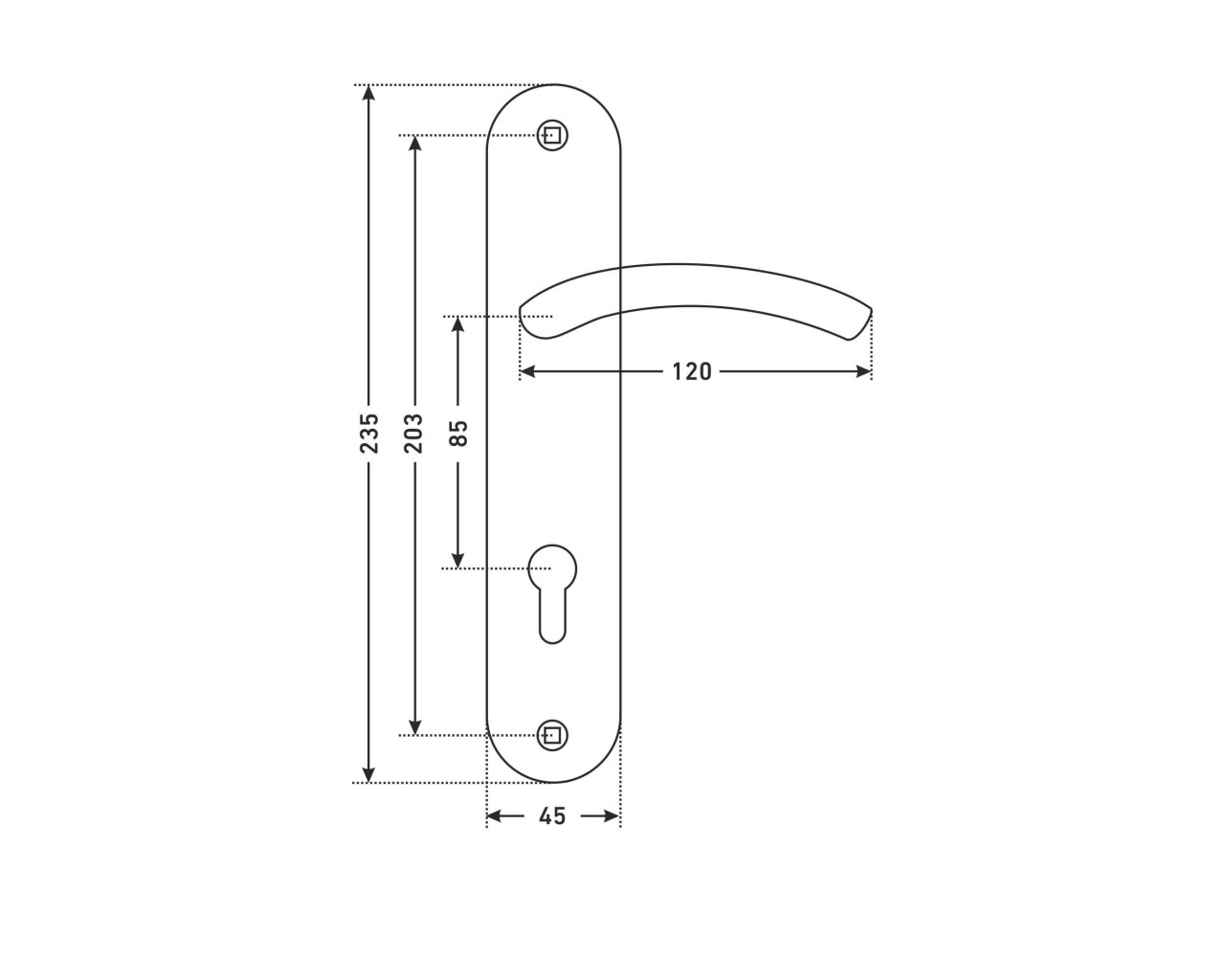 Ручка на планке под замок и цилиндровый механизм. Материал - алюминиевый сплав, покрытие - полимерная краска. Межосевое расстояние - 85 мм, размеры планки - 45 х 235 мм, длина ручки - 120 мм. В комплект входят винтовые стяжки и квадратный штырь (8х8 мм) 105 мм. Для дверей, толщиной 35-45 мм.