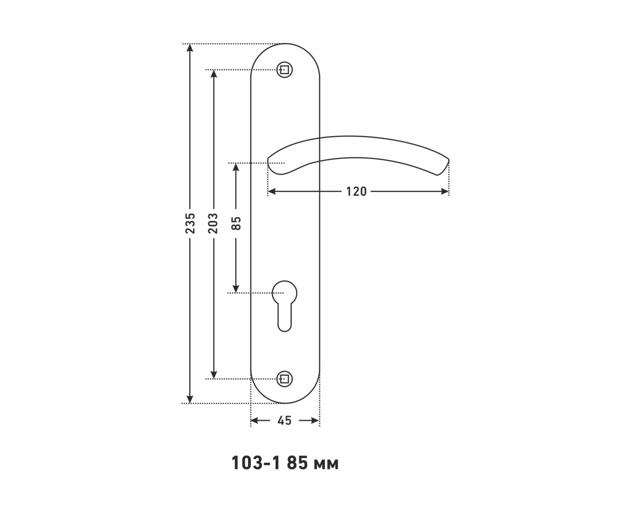Ручка на планке под замок и цилиндровый механизм. Материал - алюминиевый сплав, покрытие - полимерная краска. Межосевое расстояние - 85 мм, размеры планки - 45 х 235 мм, длина ручки - 120 мм. В комплект входят винтовые стяжки и квадратный штырь (8х8 мм) 105 мм. Для дверей, толщиной 35-45 мм.