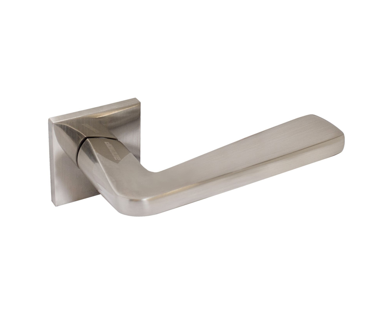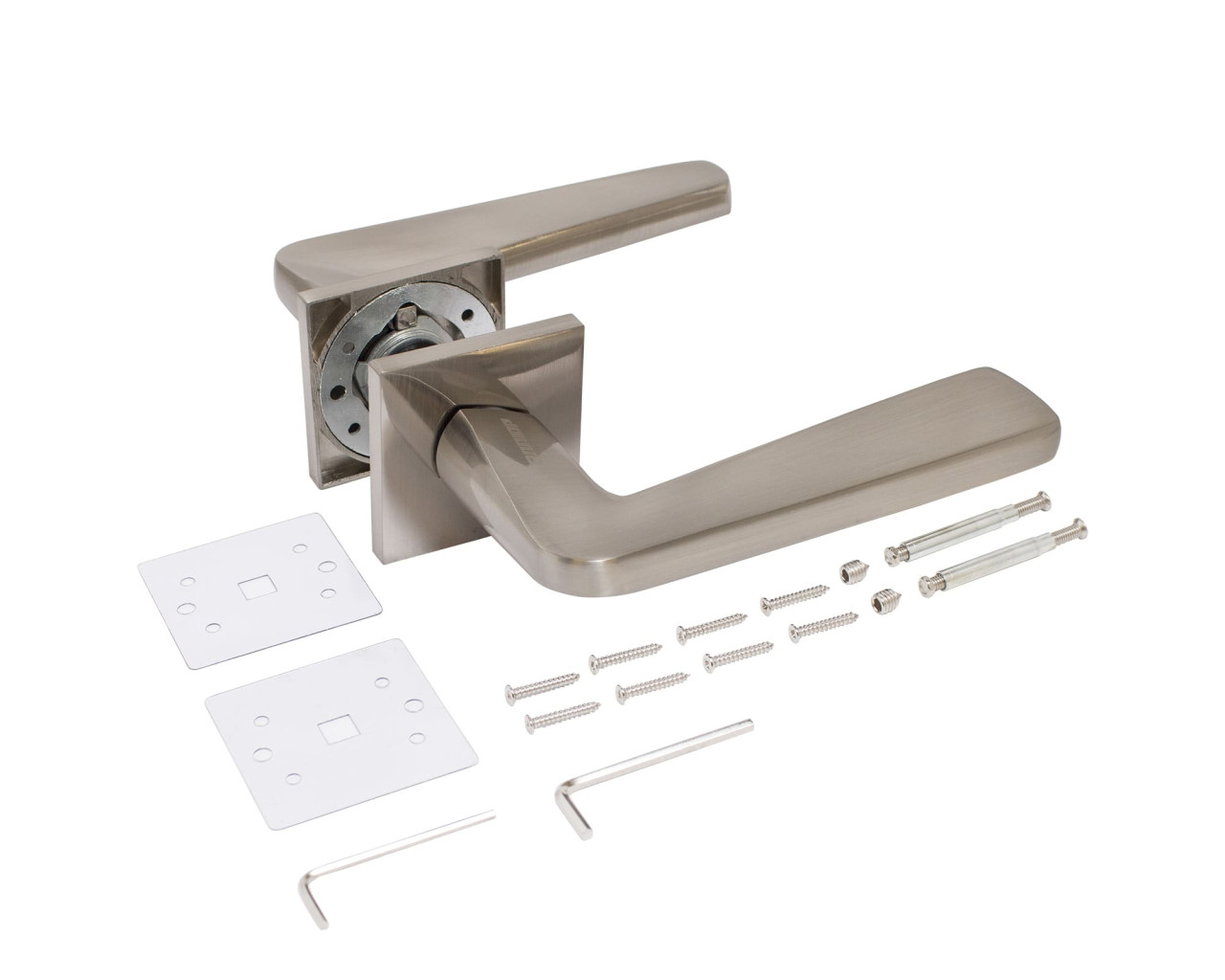 Ручка на квадратной накладке. Материал ручек — алюминиевый сплав, накладки — цинковый сплав. Многослойное гальваническое покрытие. Комплектуются винтовыми стяжками и шурупами. Длина разрезного квадрата - 105мм. Для дверей, толщиной 34-45 мм.