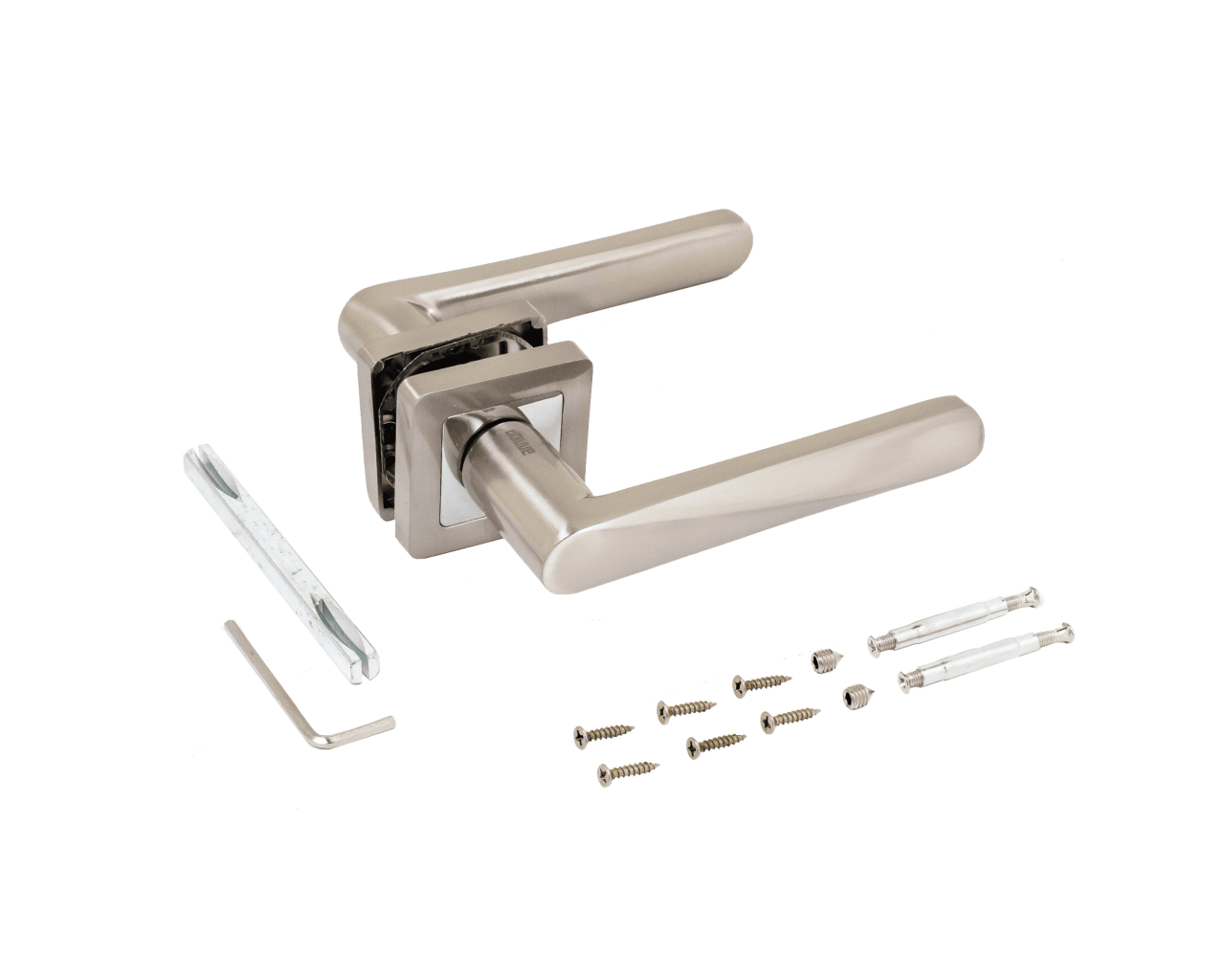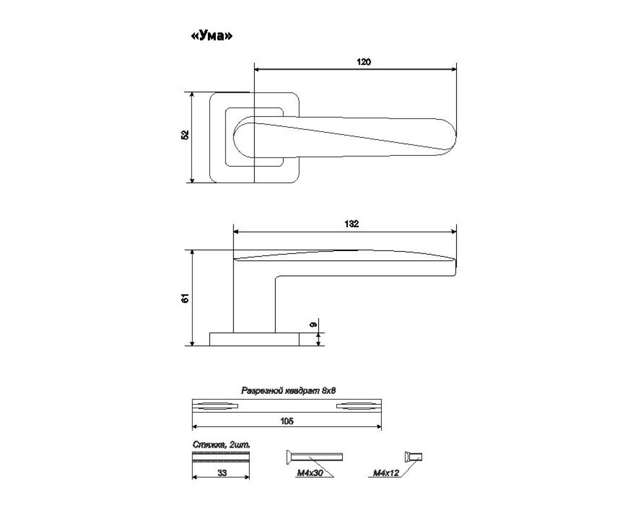 Ручка на квадратной накладке. Материал ручек — алюминиевый сплав, накладки — алюминиевый сплав. Многослойное гальваническое покрытие. Комплектуются винтовыми стяжками и шурупами. Длина разрезного квадрата - 105мм. Для дверей, толщиной 34-45 мм
