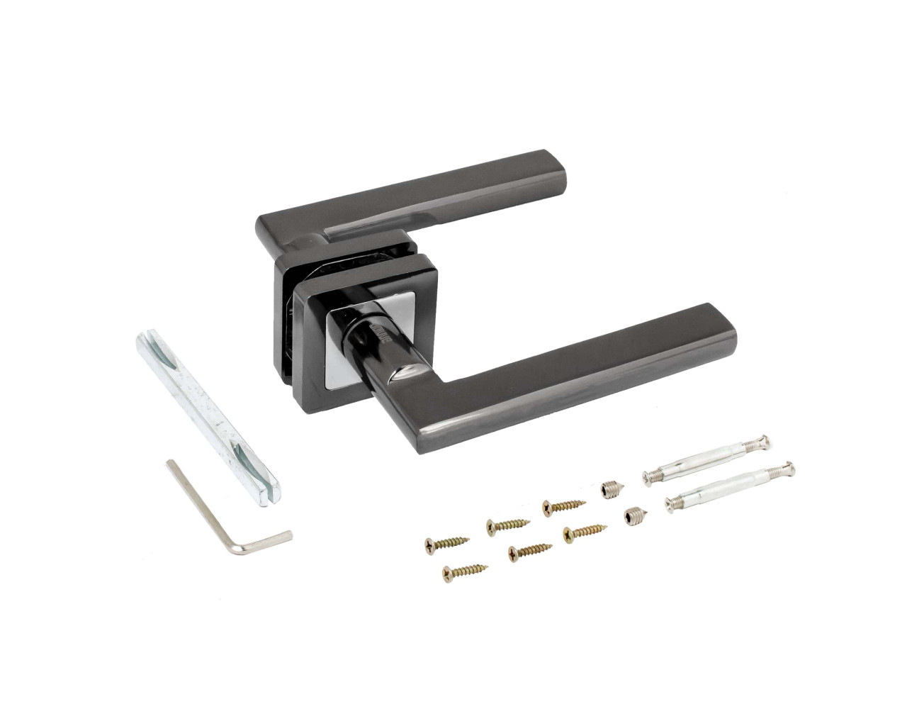 Ручка на квадратной накладке. Материал ручек — алюминиевый сплав, накладки — алюминиевый сплав. Многослойное гальваническое покрытие. Комплектуются винтовыми стяжками и шурупами. Длина разрезного квадрата - 105мм. Для дверей, толщиной 34-45 мм.