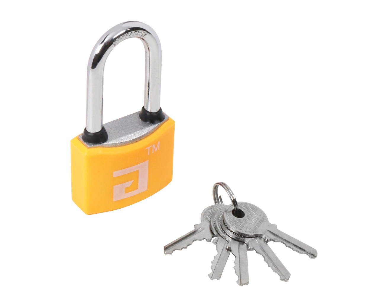 Замок навесной, в пластиковом кожухе, с увеличенным количеством ключей и длинной дужкой. Высота проема дужки - 38мм. Автоматическое закрывание. Материал корпуса - высокопрочный чугун. Корпус замка имеет защитный пластиковый кожух. Размеры корпуса - 42ммх32мм, диаметр дужки - 6 мм. Цилиндровый механизм секрета, 5 английских ключей.