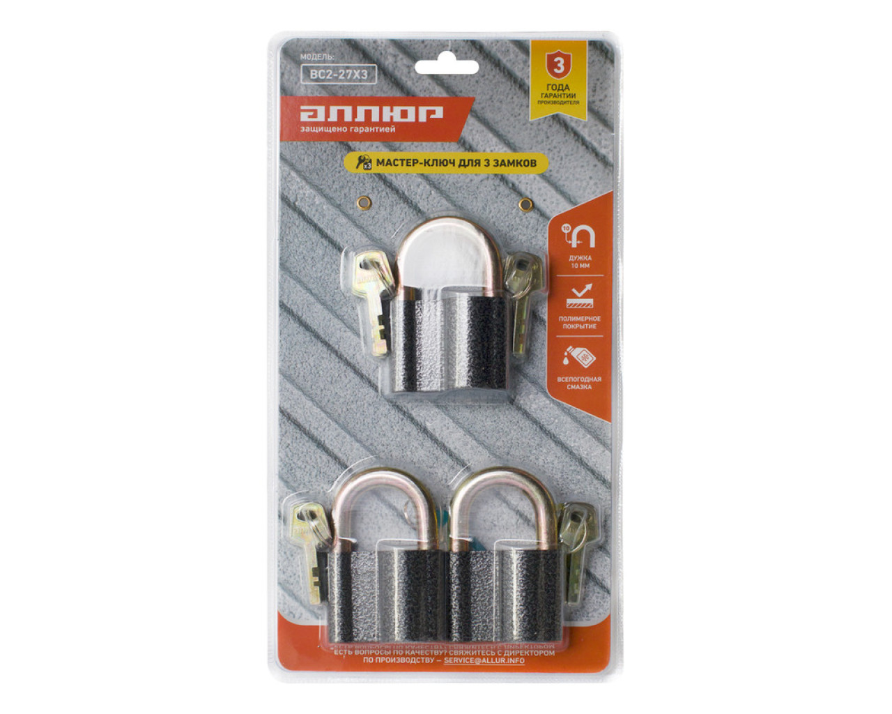 АЛЛЮР Замок навес ВС2-27-3 d10мм мастер ключ комп-3шт 4640001792083