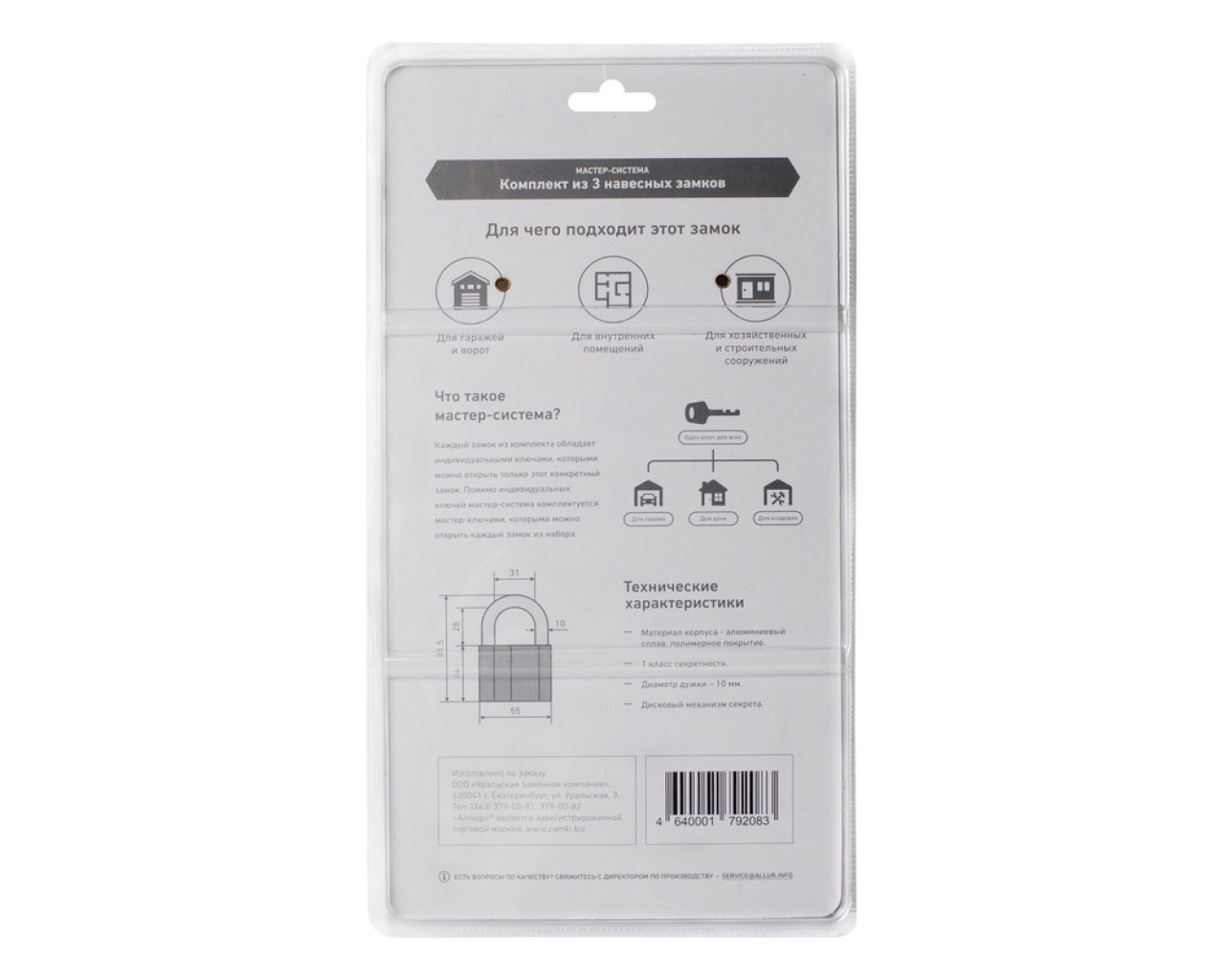 Системы МАСТЕР-КЛЮЧ с 3 навесными замками в наборе В этой системе используются индивидуальные ключи к каждому замку и один главный для всех замков Идеальное решение для дач и загородных домов нужд ЖЭУ Позволяет носить хозяину только один ключ вместо целой связки а так же распределить доступ к разным объектам между другими лицами членами семьи сторожами строителями сантехниками и др Комплектация: АЛЛЮР ВС2-27С с 3я индивидуальными ключами х3шт комплект 3-мастер ключей х1шт Материал корпуса - алюминиевый сплав полимерное покрытие Ширина основания корпуса - 55мм диаметр дужки 10мм Дисковый механизм секрета