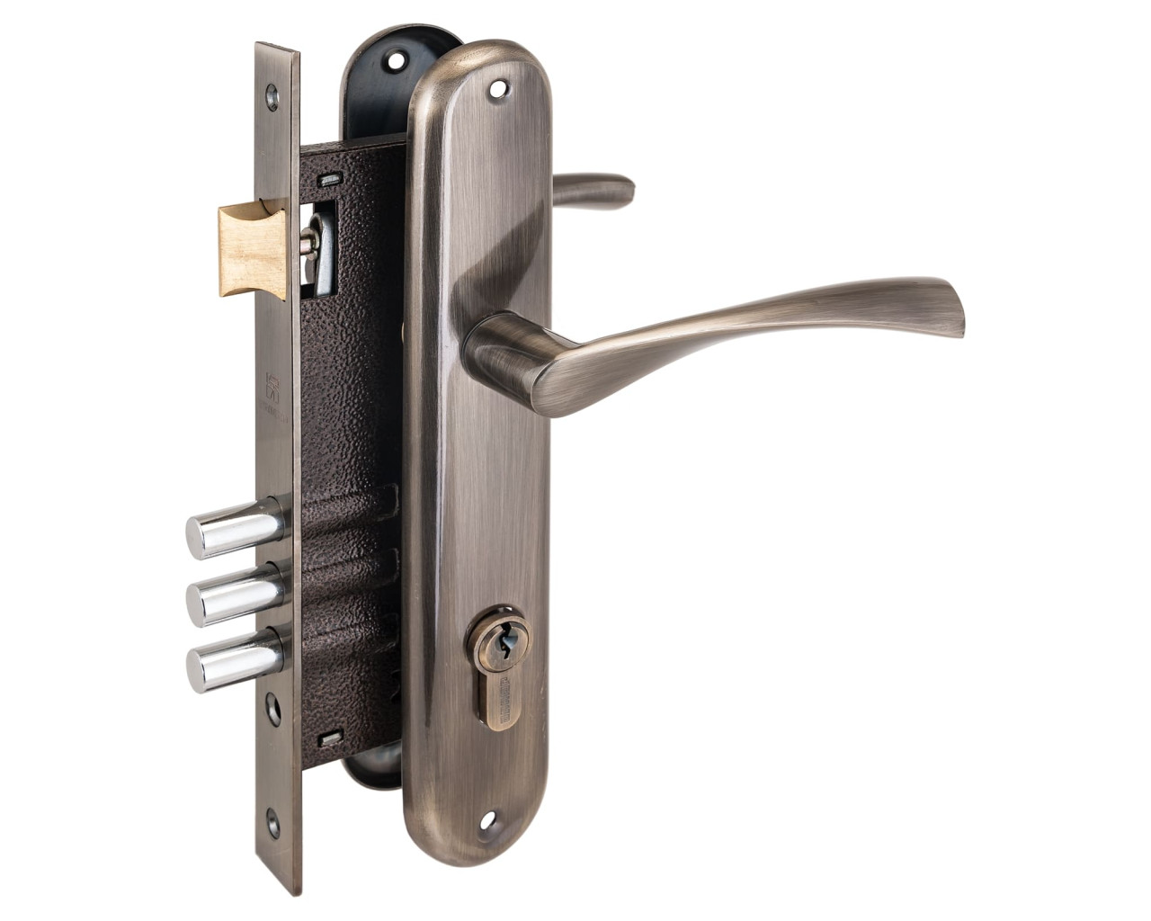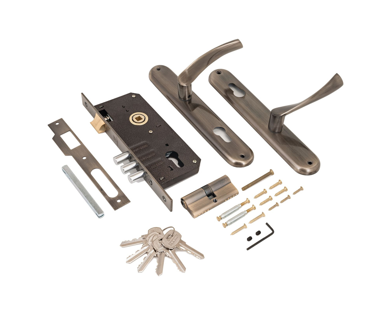 Серия "Классика". Замок врезной с ручками. Предназначен для установки в деревянные двери толщиной до 40мм, правого и левого открывания. Дверь может быть закрыта на защелку и открыта с помощью фалевой ручки при открытом засове замка. Три стальных ригеля круглого сечения диаметром 12мм, вылет 20мм. Универсальная защелка. Стальной корпус с подшипником, покрыт полимерной краской. Межосевое расстояние 85 мм. Удаление ключевого отверстия 45мм. Материал ручек алюминиевый сплав. Комплектация: цилиндровый механизм 68мм, 6 ключей, ответная планка, винтовые стяжки.