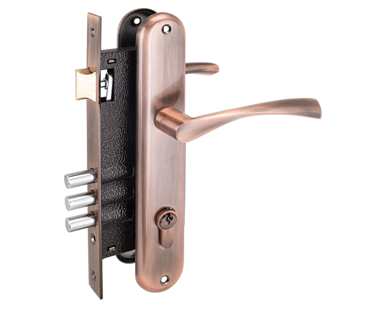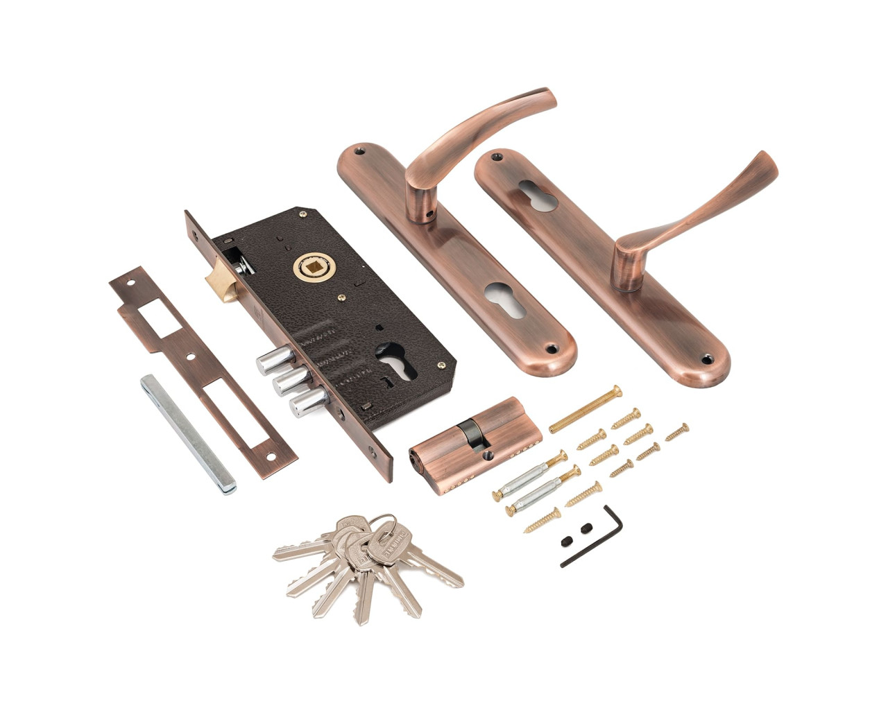 Серия "Классика". Замок врезной с ручками. Предназначен для установки в деревянные двери толщиной до 40мм, правого и левого открывания. Дверь может быть закрыта на защелку и открыта с помощью фалевой ручки при открытом засове замка. Три стальных ригеля круглого сечения диаметром 12мм, вылет 20мм. Универсальная защелка. Стальной корпус с подшипником, покрыт полимерной краской. Межосевое расстояние 85 мм. Удаление ключевого отверстия 45мм. Материал ручек алюминиевый сплав. Комплектация: цилиндровый механизм 68мм, 6 ключей, ответная планка, винтовые стяжки.