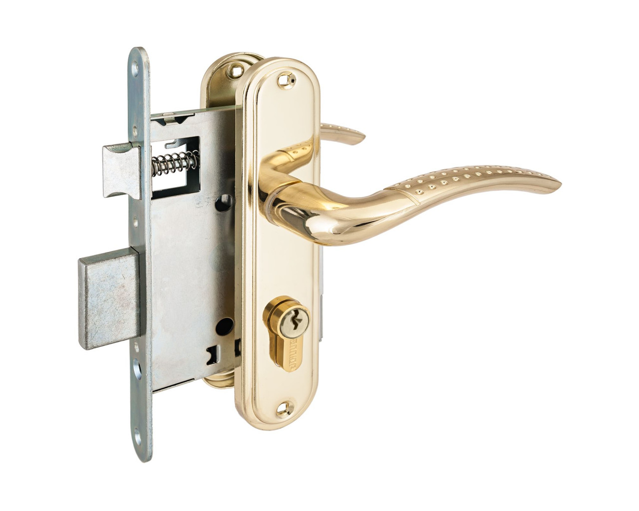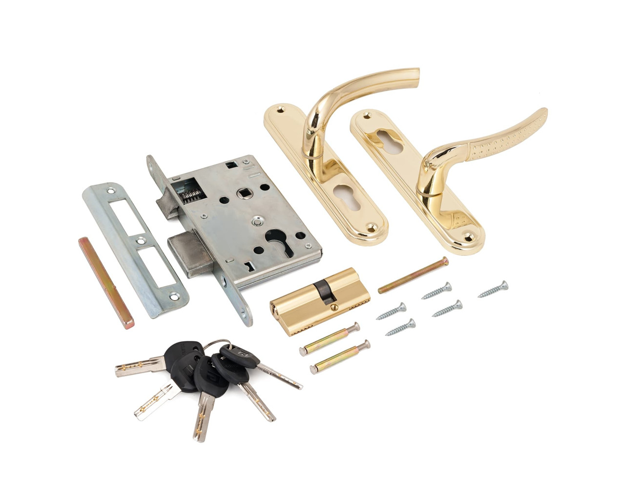 Замок врезной с комплектом ручек на планке. Предназначен для установки в деревянные двери толщиной 35 - 40 мм, правого и левого открывания. Материал ручки - алюминиевый сплав. Материал планки - сталь. Покрытие комплекта ручек: гальваническое, многослойное. Стальной оцинкованный корпус. Межосевое расстояние - 55 мм, бэксет - 55 мм. Комплектация: цинковый механизм длиной 60 мм, секретность - 4500 комбинаций, 5 английских ключей, ответная планка, квадрат 8х8 мм, винтовые стяжки, саморезы. Класс замка по ГОСТ - 1.