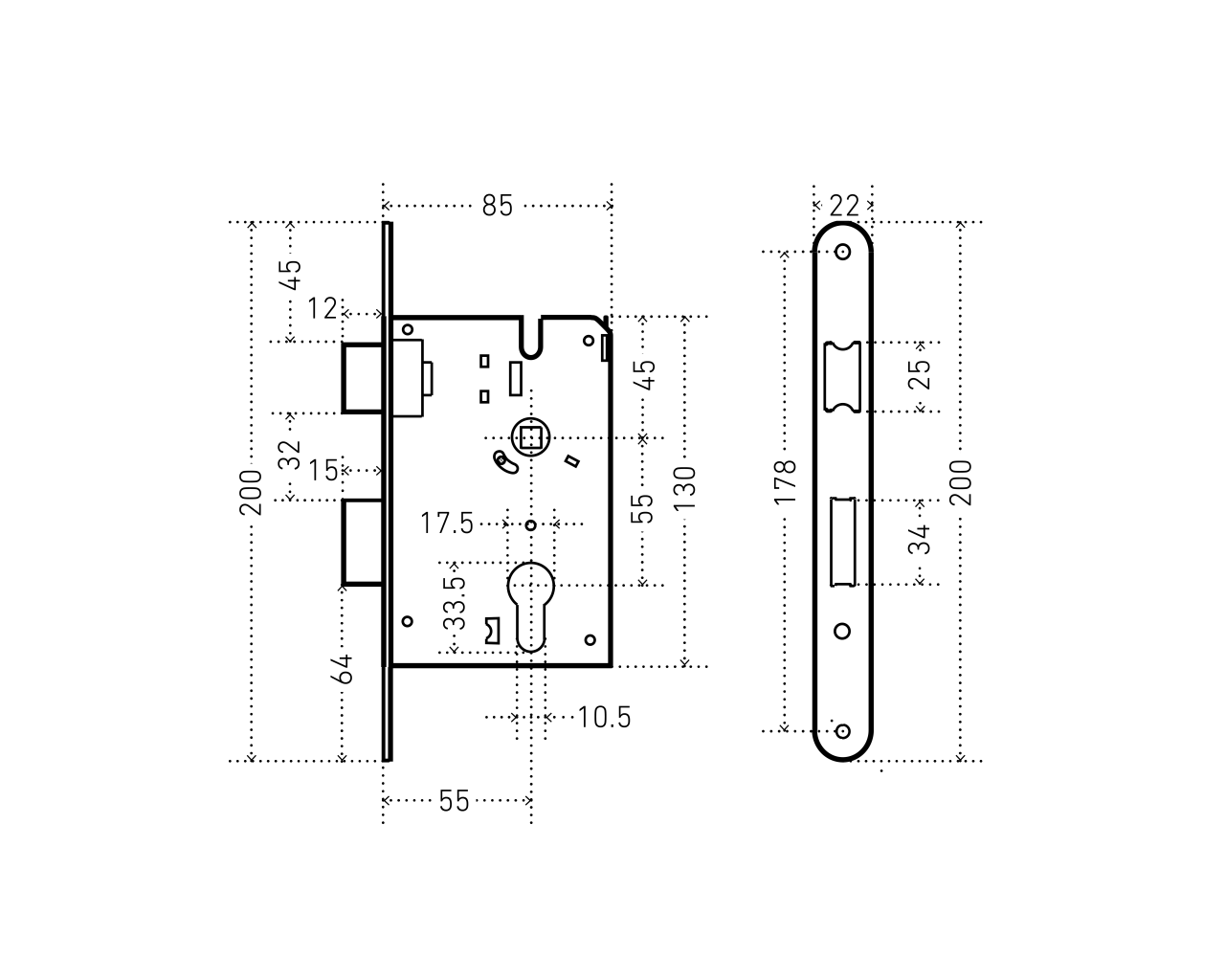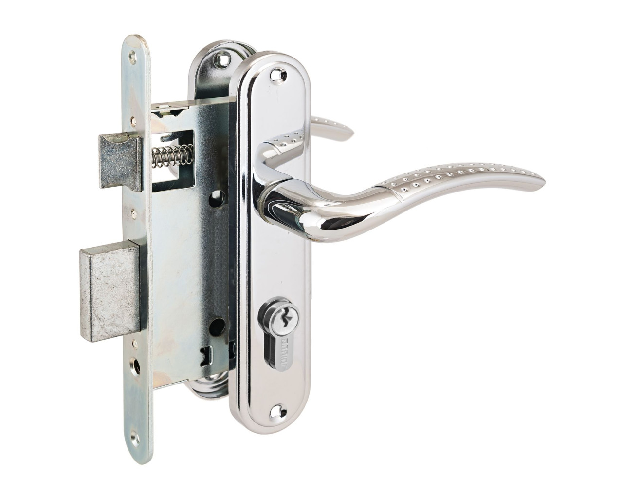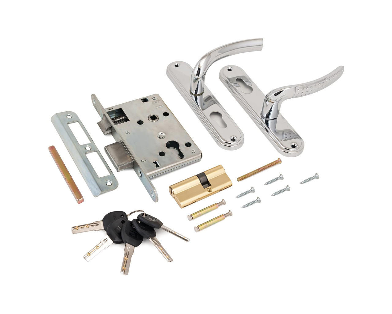 Замок врезной с комплектом ручек на планке. Предназначен для установки в деревянные двери толщиной 35 - 40 мм, правого и левого открывания. Материал ручки - алюминиевый сплав. Материал планки - сталь. Покрытие комплекта ручек: гальваническое, многослойное. Стальной оцинкованный корпус. Межосевое расстояние - 55 мм, бэксет - 55 мм. Комплектация: цинковый механизм длиной 60 мм, секретность - 4500 комбинаций, 5 английских ключей, ответная планка, квадрат 8х8 мм, винтовые стяжки, саморезы. Класс замка по ГОСТ - 1.