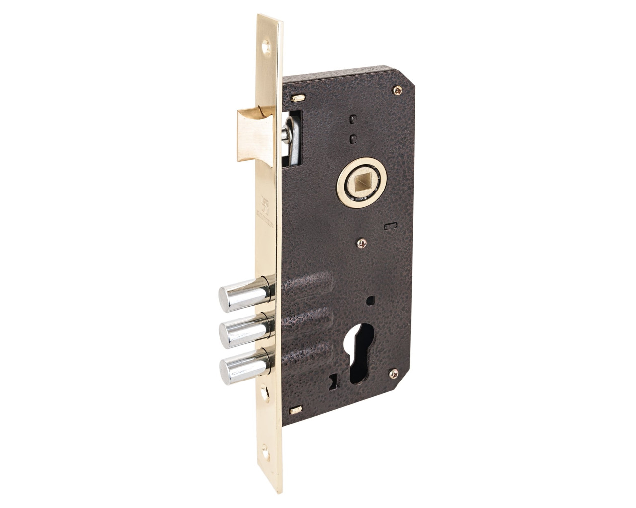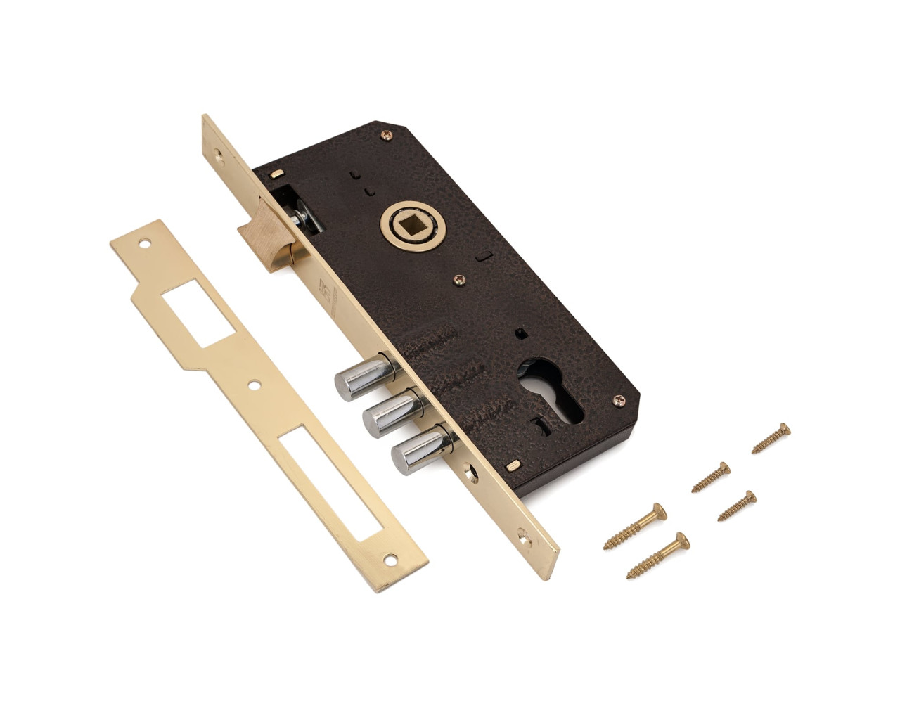 Замок врезной цилиндровый, без механизма секрета. Предназначен для установки в деревянные двери. Три цилиндрических стальных ригеля, диаметр 12мм. Вылет ригелей 20мм. Удаление ключевого отверстия 45мм. Межосевое расстояние 85мм. Цвет торцевой планки - латунь, ширина 22мм.