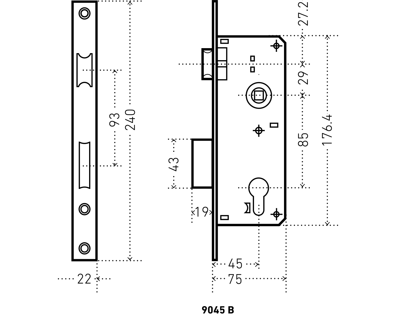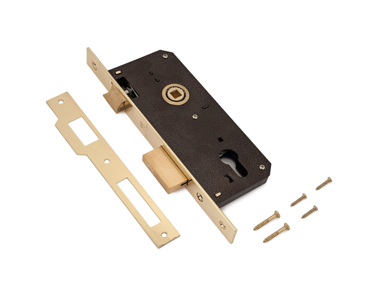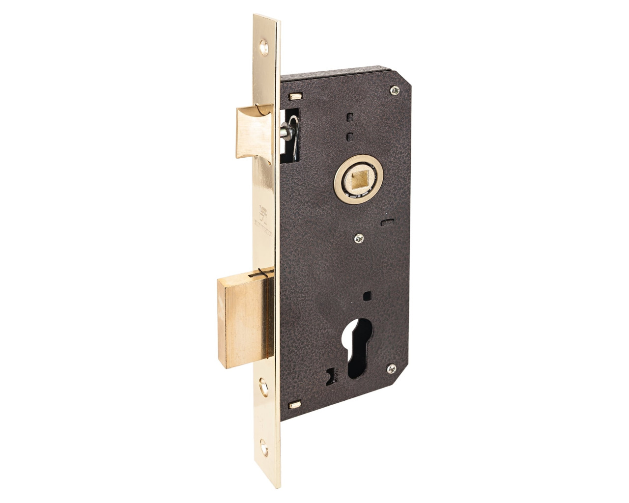 Замок врезной цилиндровый, без механизма секрета. Предназначен для установки в деревянные двери. Прямоугольный ригель, вылет 20мм. Удаление ключевого отверстия 45мм. Межосевое расстояние 85мм. Цвет торцевой планки - золото, ширина 22мм.