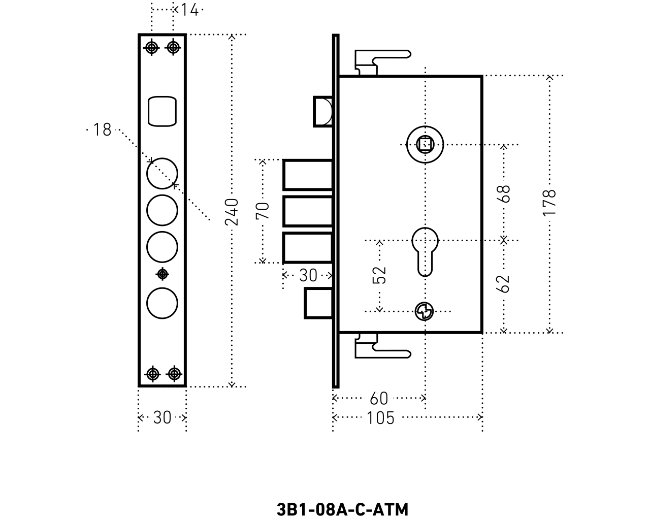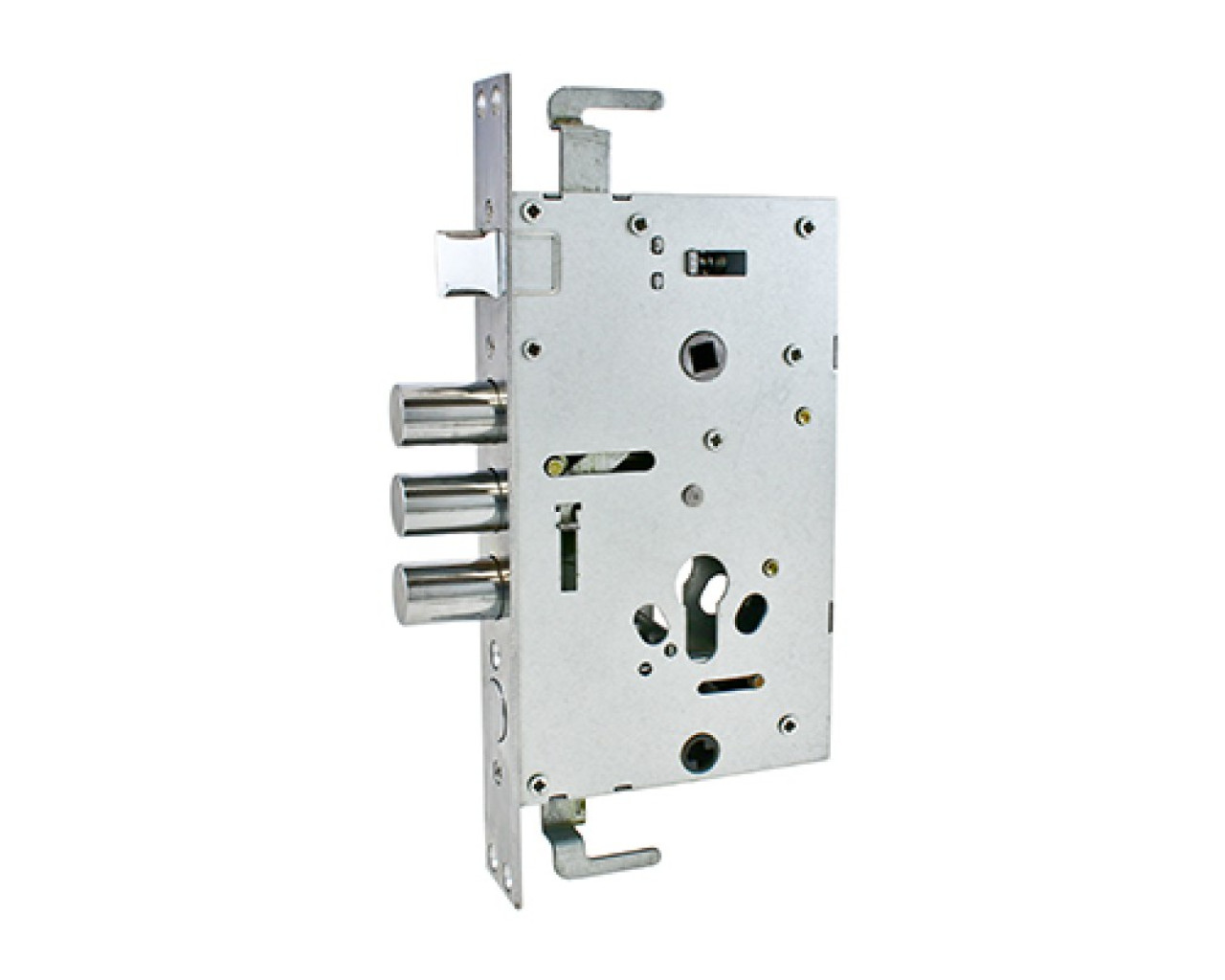 Замок врезной цилиндровый с защелкой и задвижкой, без механизма секрета. Предназначен для установки в правые китайские металлические двери, в качестве основного замка. Замок закрывается снаружи автоматически, поднятием ручки вверх. Три цилиндрических стальных ригеля, диаметр - 18мм. Вылет ригелей - 27,7 мм. 3 точки запирания. Корпус замка - сталь, толщиной 1,1мм. Удаление ключевого отверстия 60мм. Межосевое расстояние 68мм. Расстояние от центра механизма секрета до задвижки 52мм. Цвет торцевой планки - хром, ширина 30мм.