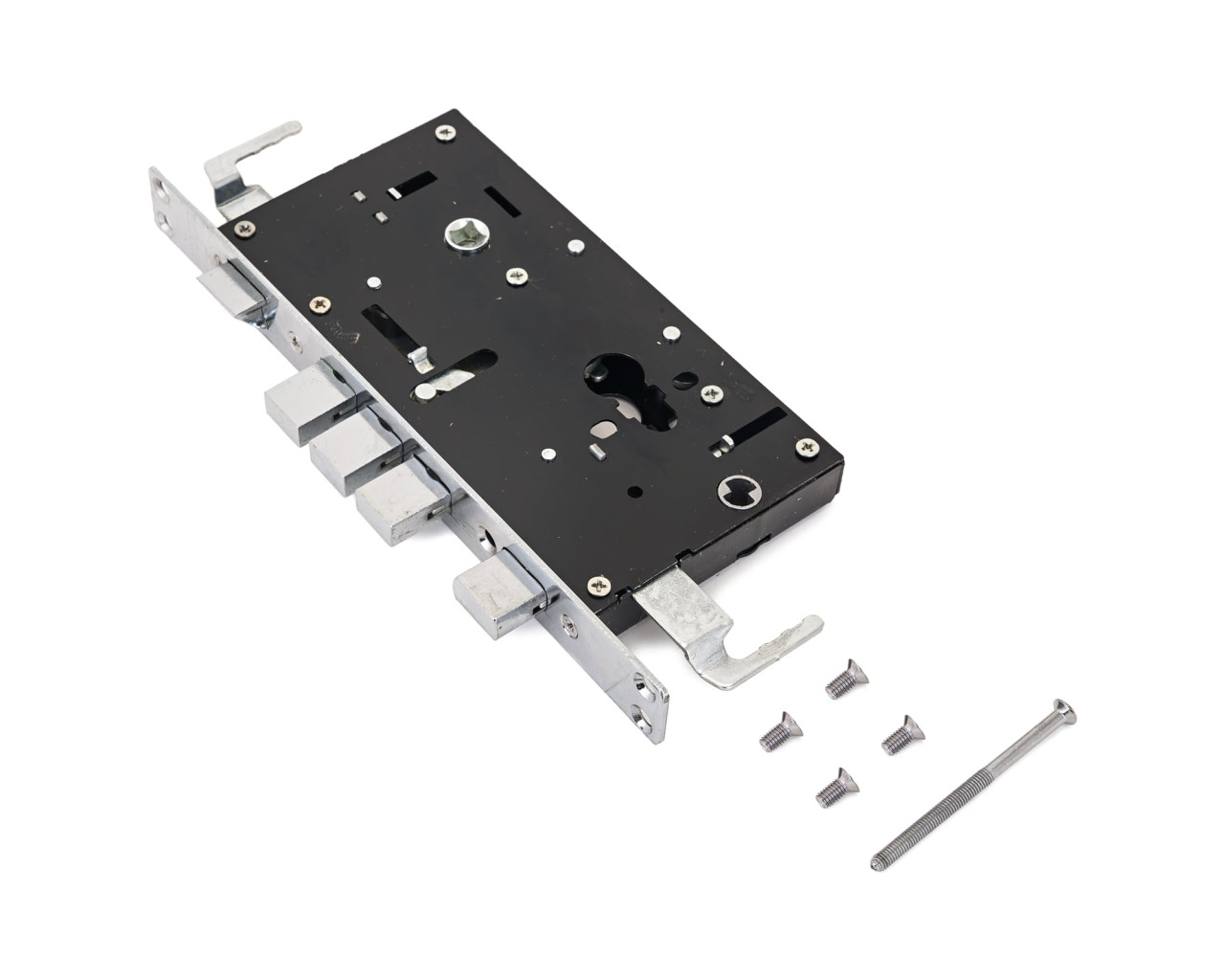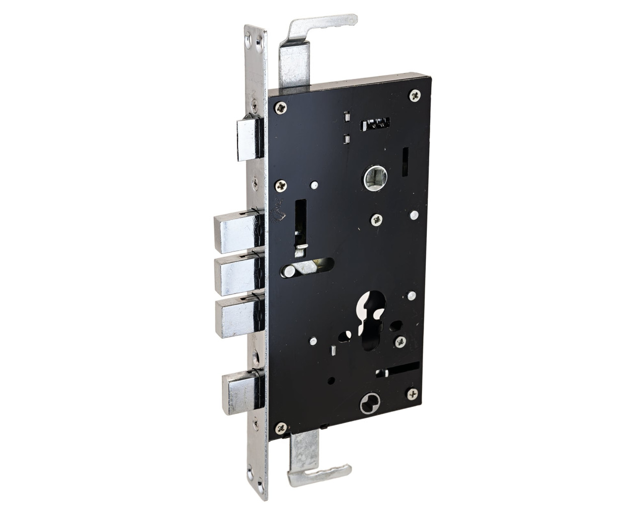 Замок врезной цилиндровый с защелкой и задвижкой, без механизма секрета. Предназначен для установки в правые китайские металлические двери, в качестве основного замка. Замок закрывается снаружи автоматически, поднятием ручки вверх. Три прямоугольных стальных ригеля. Вылет ригелей 20мм. 3 точки запирания. Корпус замка - сталь, толщиной 1,1мм. Удаление ключевого отверстия 60мм. Межосевое расстояние 68мм. Расстояние от центра механизма секрета до задвижки 52мм. Цвет торцевой планки - хром, ширина 24мм.