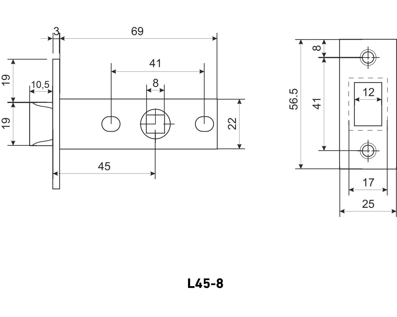 Универсальная защёлка врезная для установки на деревянные межкомнатные двери. Материал - сталь оцинкованная штампованная, гальваническое покрытие. Под ручку с квадратом 8 мм. Удаление ключевого отверстия - 45 мм. Торцевая планка с защитной пленкой для сохранения покрытия. Ширина планки - 25мм. Габариты корпуса - 72.5х22х15 мм. В комплекте - защелка, ответная планка и белый пластиковый вкладыш к ней, саморезы.