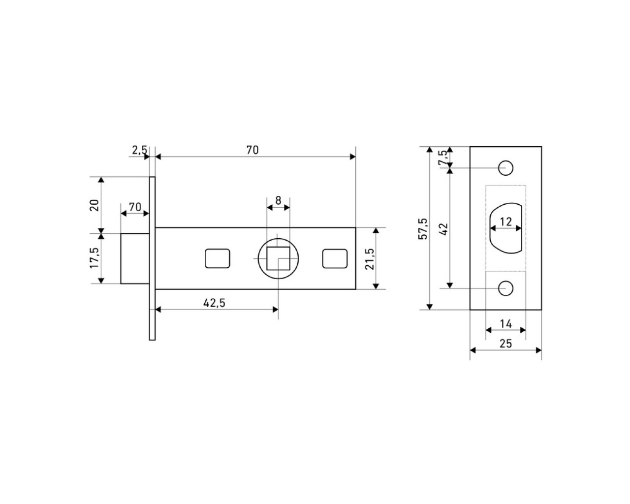 Универсальная защлка врезная для установки на деревянные межкомнатные двери Материал - сталь оцинкованная штампованная гальваническое покрытие Под ручку с квадратом 8 мм Удаление ключевого отверстия - 45 мм Торцевая планка с защитной пленкой для сохранения покрытия Ширина планки - 25мм Габариты корпуса - 725х22х15 мм В комплекте - защелка ответная планка и белый пластиковый вкладыш к ней саморезы
