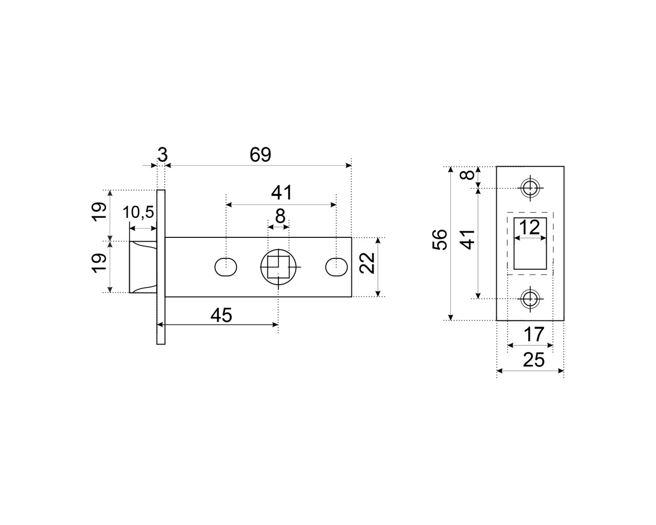 Универсальная защёлка врезная для установки на деревянные межкомнатные двери. Малошумный язычок защелки из ударопрочного пластика под цвет торцевой планки. Материал корпуса - сталь оцинкованная штампованная, гальваническое покрытие. Под ручку с квадратом 8 мм. Удаление ключевого отверстия - 45 мм. Ширина планки - 25мм. Габариты корпуса - 72.5х22х15 мм. В комплекте - защелка, ответная планка и белый пластиковый вкладыш к ней, саморезы.