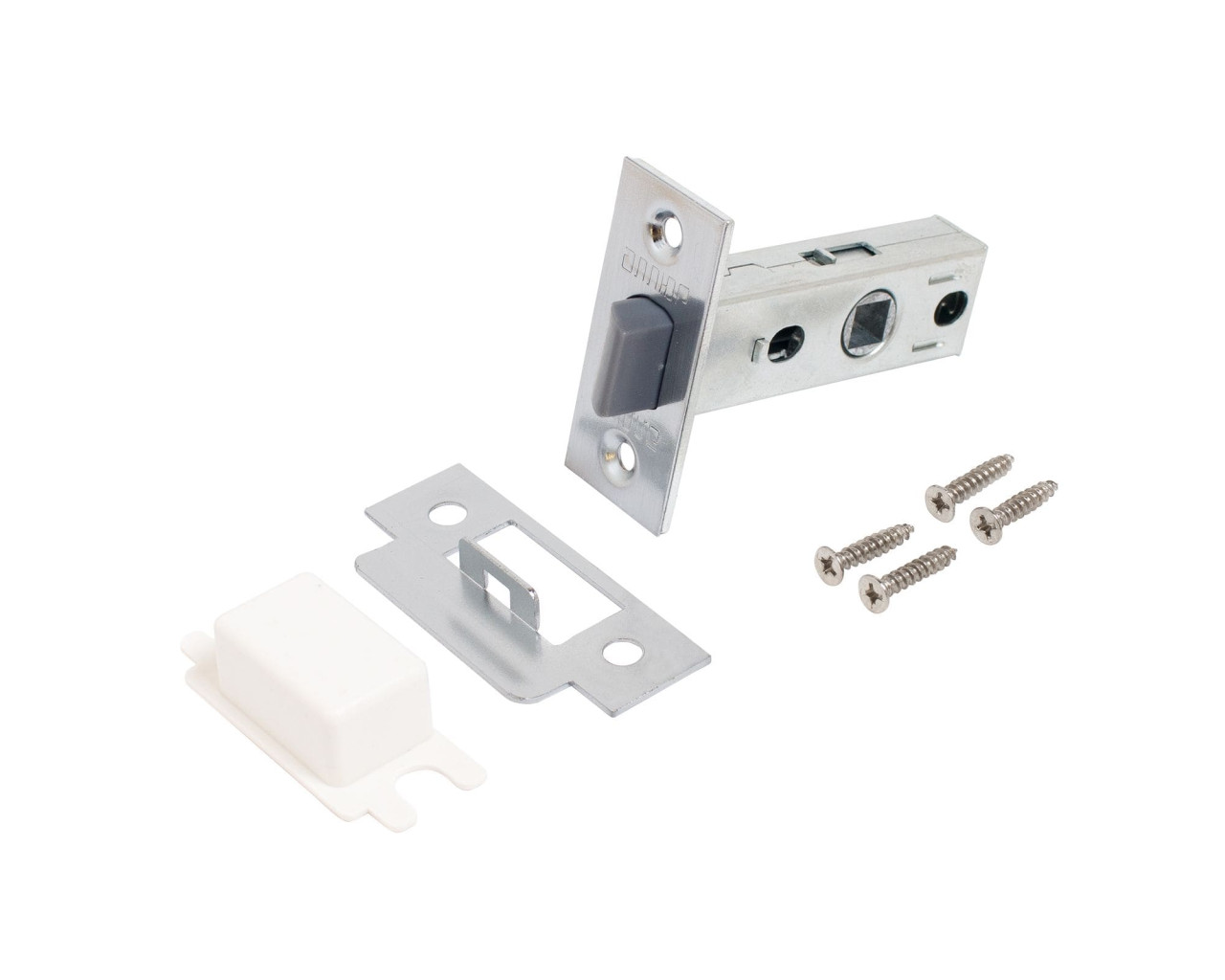 Универсальная защёлка врезная для установки на деревянные межкомнатные двери. Малошумный язычок защелки из ударопрочного пластика под цвет торцевой планки. Материал корпуса - сталь оцинкованная штампованная, гальваническое покрытие. Под ручку с квадратом 8 мм. Удаление ключевого отверстия - 45 мм. Ширина планки - 25мм. Габариты корпуса - 72.5х22х15 мм. В комплекте - защелка, ответная планка и белый пластиковый вкладыш к ней, саморезы.