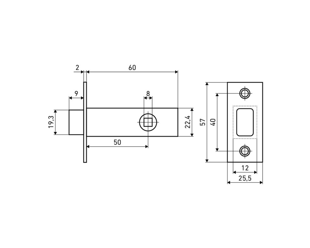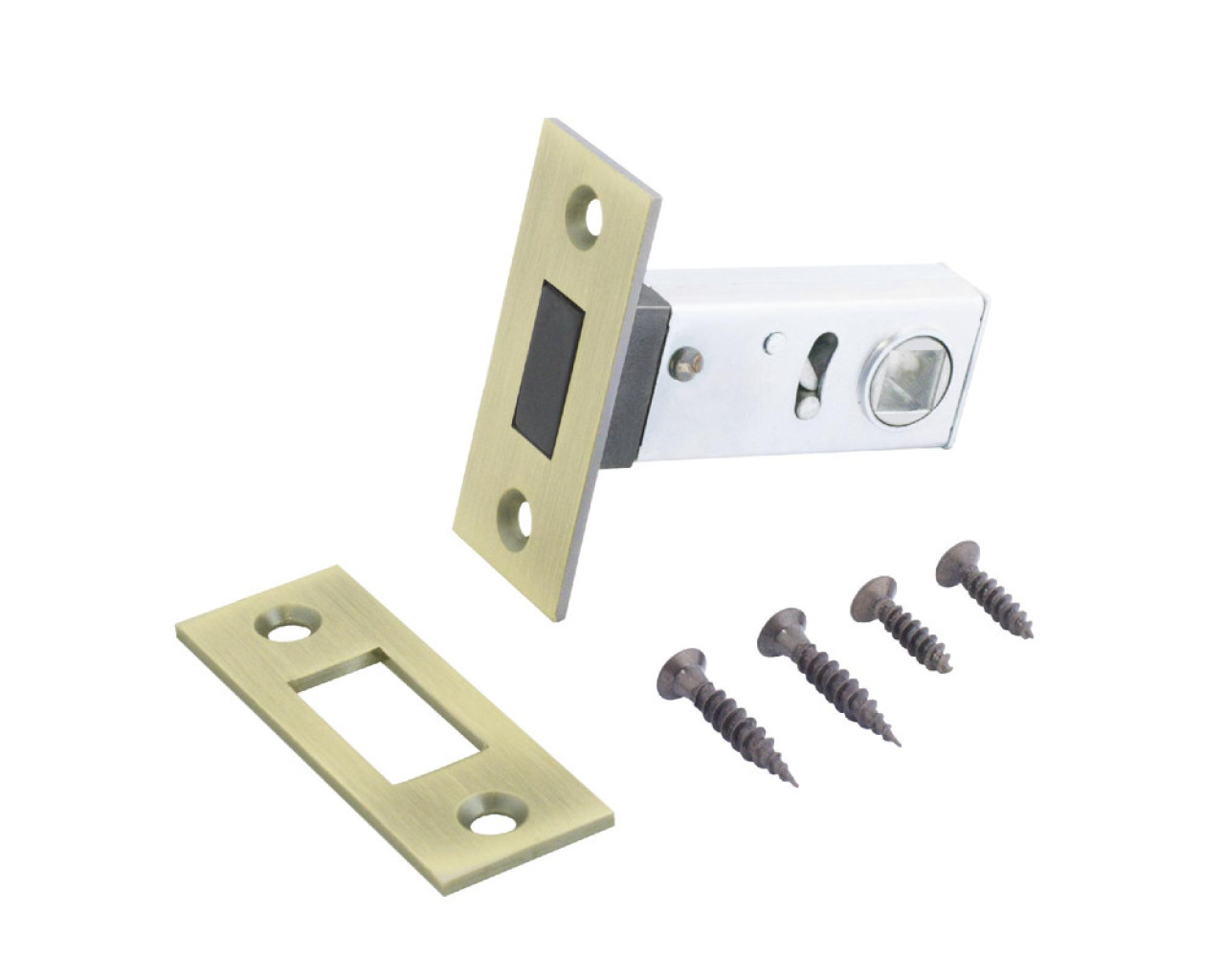 Универсальная магнитная врезная защелка для установки на деревянные двери Совместим с ручками под квадратный стержень 88 мм Материал - сталь гальваническое покрытие Торцевая планка 57х25 мм Бексет 50 мм Засов из ударопрочного пластика обеспечивает бесшумную работу