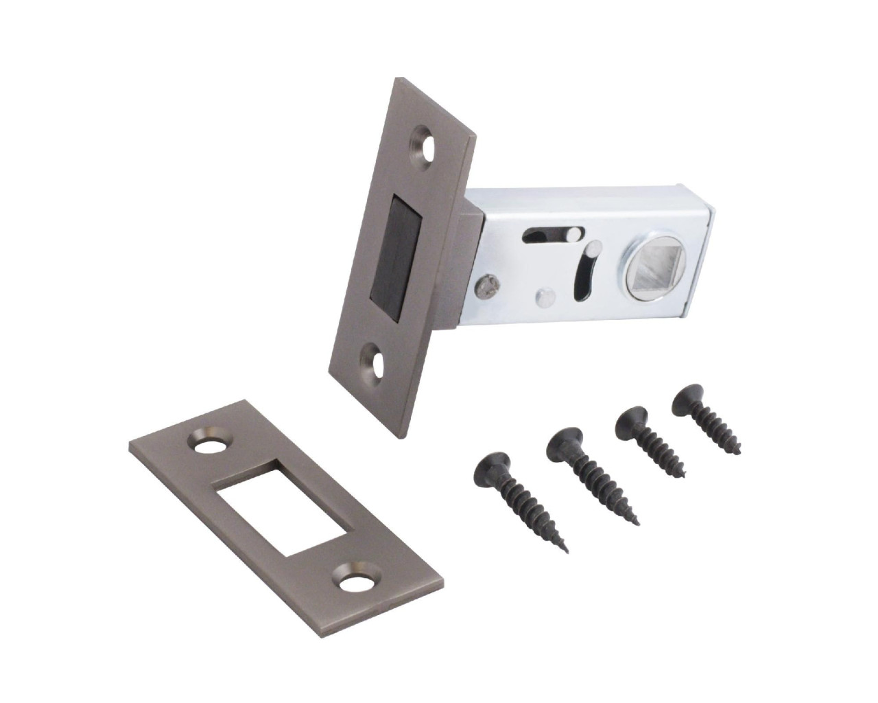 Универсальная магнитная защёлка врезная для установки на деревянные межкомнатные двери. Материал - сталь оцинкованная штампованная, магнит, гальваническое покрытие. Под ручку с квадратом 8 мм. Удаление ключевого отверстия - 50 мм. Ширина планки - 25мм. Габариты корпуса - 63х22,5х15 мм. В комплекте - защелка, ответная планка и саморезы. Использование магнитов позволяет добиться бесшумности в работе.
