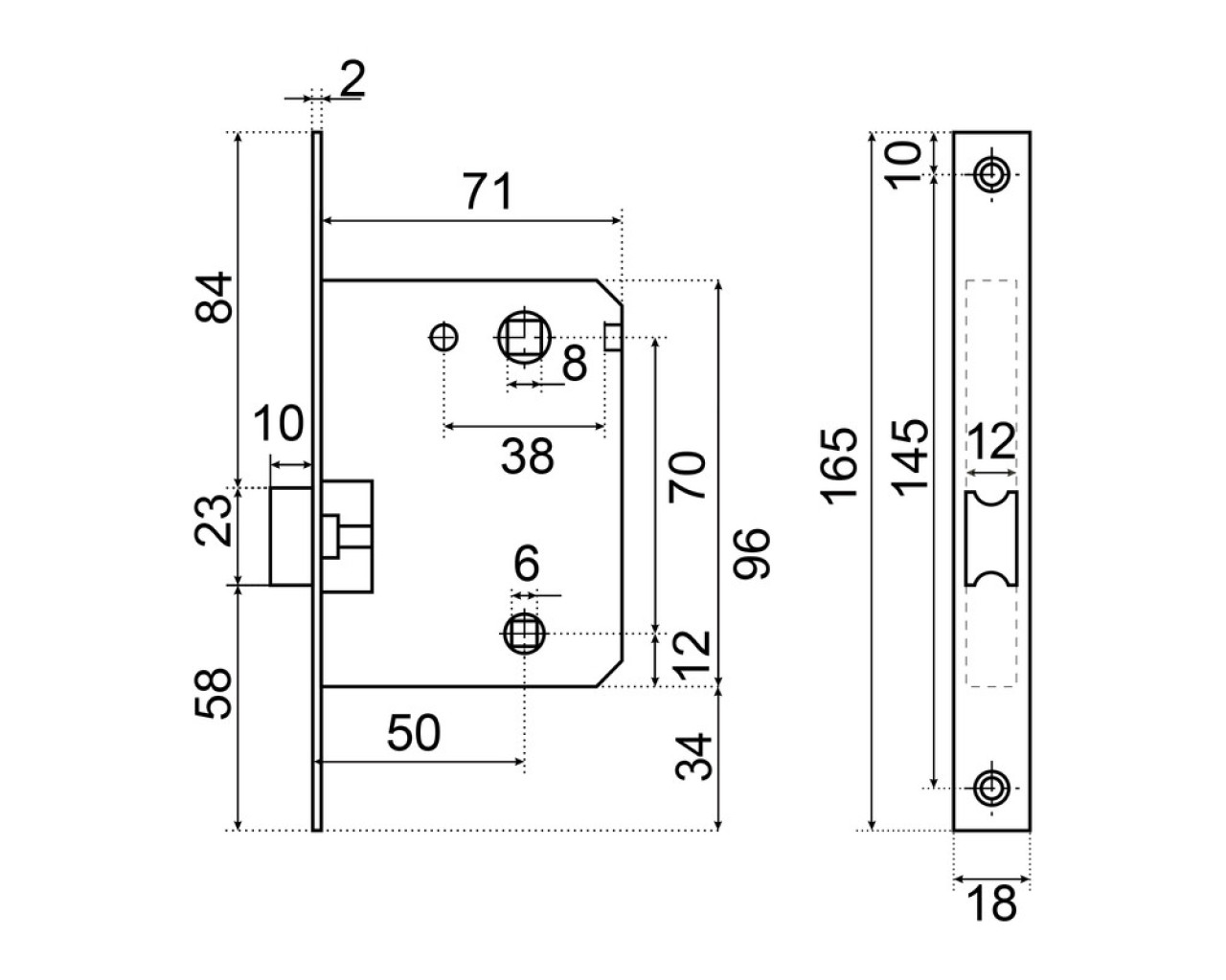 Универсальная защлка врезная для установки на деревянные межкомнатные двери Материал - сталь гальваническое покрытиеПод ручку с квадратом 8 мм и сантехническую завертку с квадратом 6 мм Удаление ключевого отверстия - 47 мм Межосевое расстояние - 70 мм Прямоугольная торцевая планка Ширина планки - 18мм Габариты корпуса - 96х71х12 мм В комплекте - защелка саморезы ответная планка и белый пластиковый вкладыш к ней