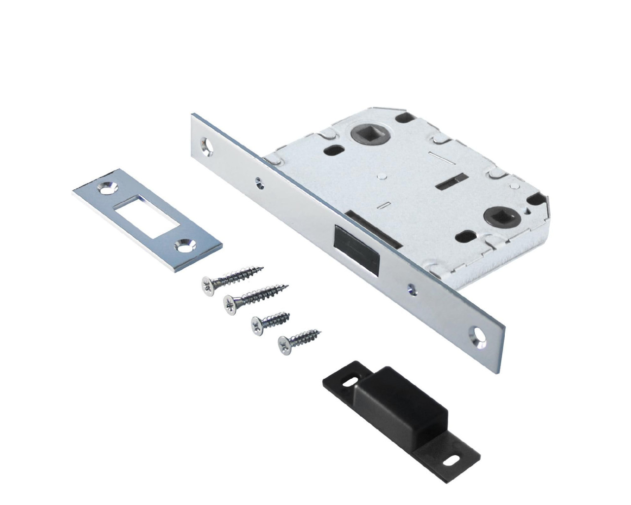 Универсальная защёлка врезная для установки на деревянные межкомнатные двери. Материал - сталь, гальваническое покрытие.Под ручку с квадратом 8 мм и сантехническую завертку с квадратом 6 мм. Удаление ключевого отверстия - 50 мм. Межосевое расстояние - 70 мм. Прямоугольная торцевая планка. Ширина планки - 18мм. Габариты корпуса - 96х71х12 мм. В комплекте - защелка, саморезы, ответная планка и пластиковый вкладыш к ней.