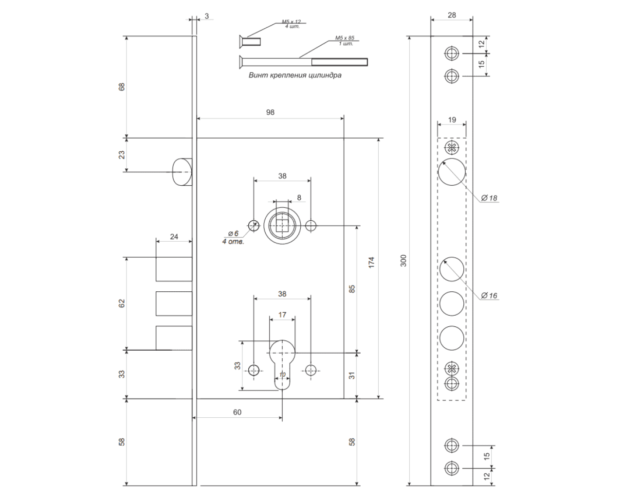 Технические характеристики: -Габаритные размеры - 98174 -Рекомендован для установки в входные двери - -Тип крепления -Лицевая планка -Количество ригелей -4 -Вылет ригелей -24 мм -Диаметр ригеля -18 мм -Удаление ключевого отверстия Backset -60 мм -Комплектация цилиндром -Не комплектуется -Тип защелки -Универсальная -Межосевое расстояние -85 мм -Комплектация ручками -Не комплектуется -Автоматическое запирание -Не автоматическое -Количество точек запирания -1 -Покрытие лицевой планки -Гальваника -Цвет лицевой планки -Хром