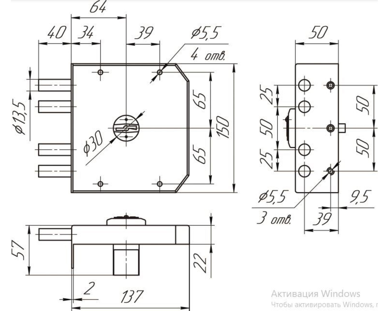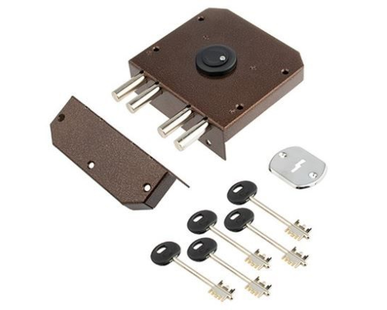 Замок накладной сувальдный. Предназначен для установки на металлические двери правого и левого открывания. Засов из четырех цилиндрических ригелей диаметром 14 мм, с максимальным вылетом 40 мм. Удаление ключевого отверстия - 64 мм. Количество полуоборотов ключа - 4. Габариты замка - 137х150х22 мм. Комплектация - 5 ключей, запорная коробка, накладка на ключевое отверстие.