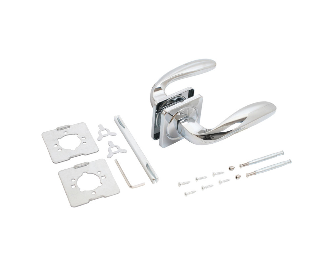 Ручка на квадратной накладкеМатериал ручек алюминевый сплав накладки цинковый сплав Многослойное гальваническое покрытие Комплектуются винтовыми стяжками и шурупами Длина разрезного квадрата - 130мм Для дверей толщиной 40-110 мм