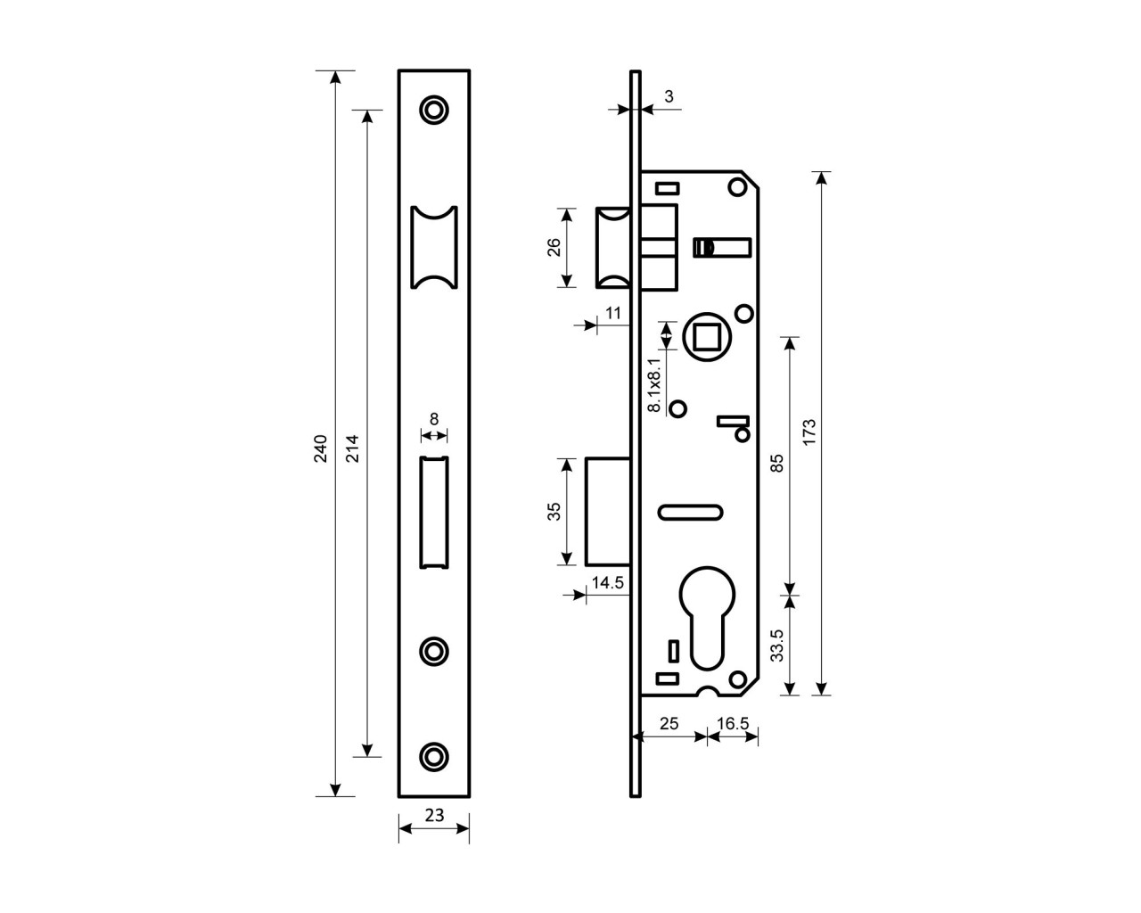 Замок врезной цилиндровый, без механизма. Предназначен для установки в узкопрофильные двери и калитки. Торцевая планка из нержавеющей стали SS201. Ответная планка в комплекте.