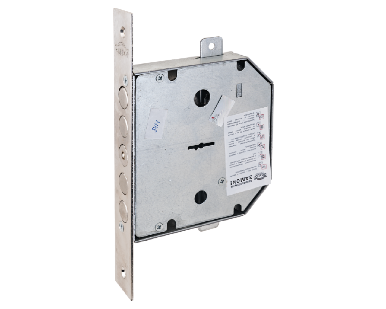 Замок врезной сувальдный с тягами для металлических дверей. Замок имеет засов из пяти цилиндрических ригелей диаметром 18 мм, с максимальным вылетом 40 мм, и тяги с вылетом 20 мм. Удаление ключевого отверстия 66,5 мм. Количество оборотов ключа - 4. Габариты замка - 137,5х146х30 мм. Комплектация - 5 ключей, съемная торцевая планка, комплект накладок. В одном из ригелей расположен закаленный стальной стержень, обеспечивающий надежную защиту от перепиливания. Защита от криминального и силового взлома, высверливания, выдавливания.
