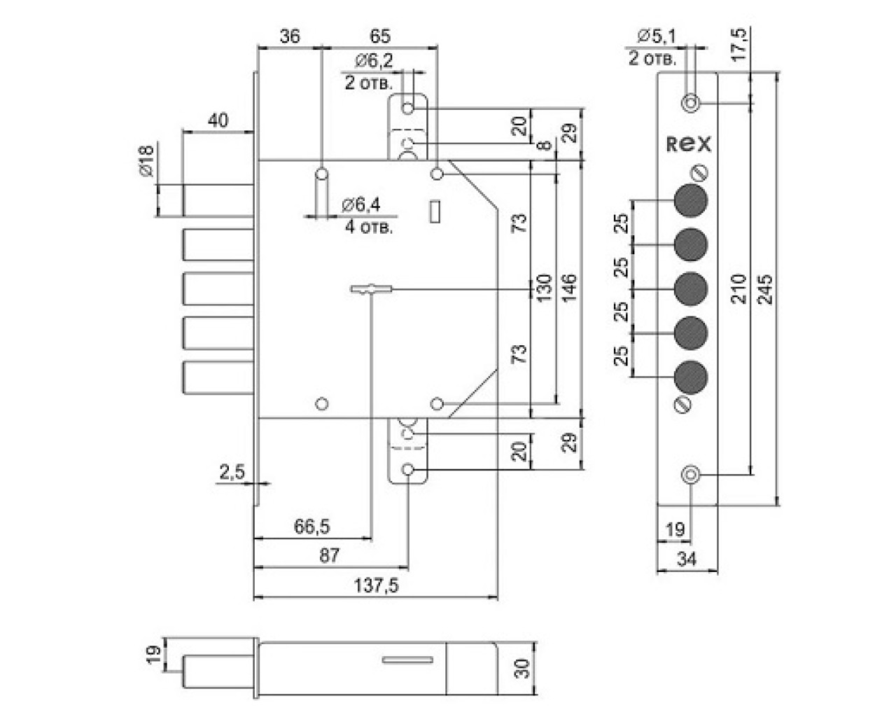 Замок врезной сувальдный с тягами. Предназначен для металлических дверей. Замок имеет засов из пяти цилиндрических ригелей диаметром 18 мм, с максимальным вылетом 40 мм, и тяги с вылетом 20 мм. Удаление ключевого отверстия 68 мм. Количество оборотов ключа - 4. Габариты замка - 137,5х146х30 мм. Комплектация - 5 ключей.