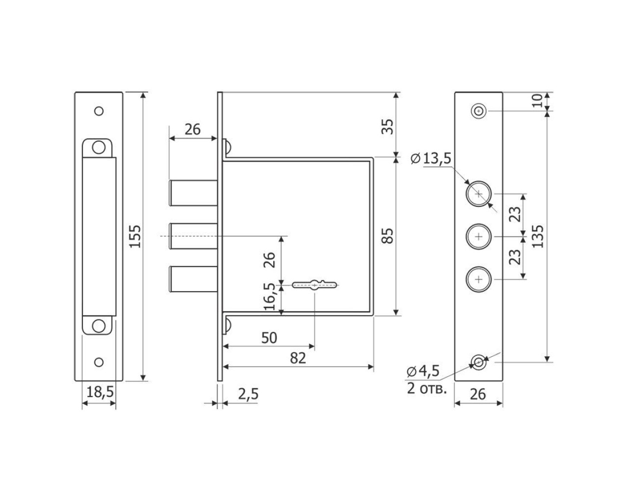 Замок врезной 6-сувальдный. Предназначен для установки в металлические и деревянные двери, металлические шкафы и сейфы. Три цилиндрических ригеля, диаметром 13,5мм, вылет 26мм. Удаление ключевого отверстия 50мм. Стальная торцевая планка, покрытие - никель, ширина планки 26мм. 4ключа.