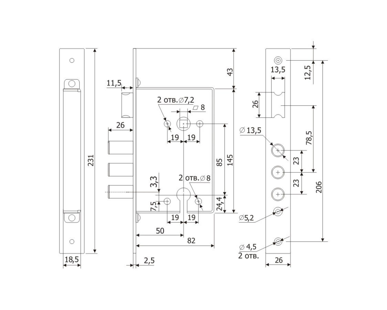 Замок врезной цилиндровый с защелкой, без механизма. Предназначен для установки в металлические и деревянные двери, металлические шкафы и сейфы. Три цилиндрических ригеля, диаметром 13,5мм, вылет 26мм. Межосевое расстояние 85мм. Удаление ключевого отверстия 50мм. Стальная торцевая планка, покрытие - никель, ширина планки 26мм.