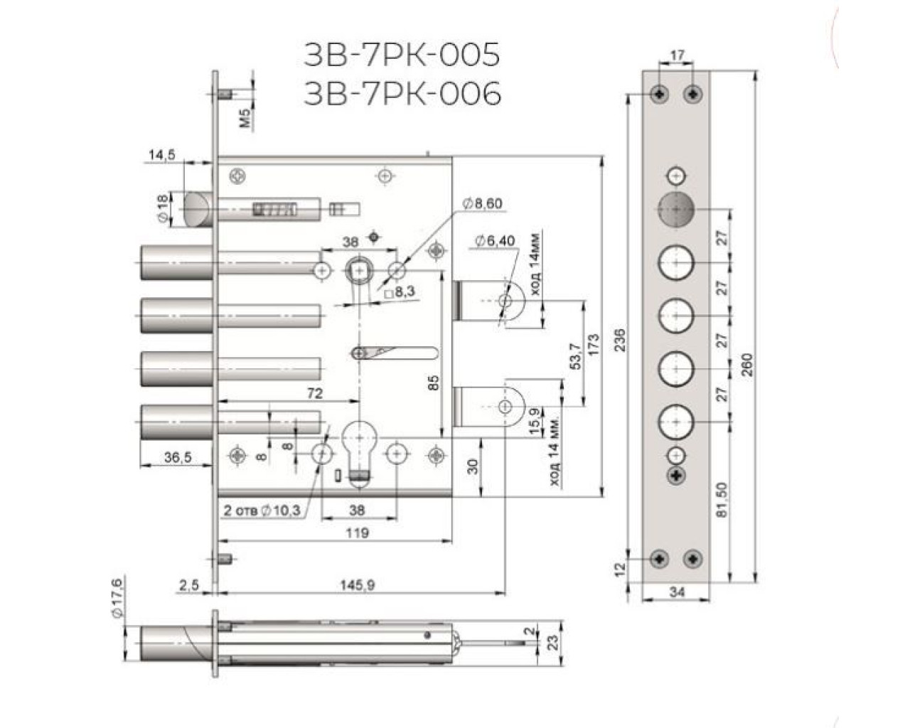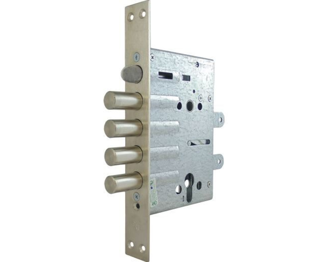 Бэксет составляет 75мм. - Представленный замок оснащен засовом, который состоит из четырёх штырей, обладающих диаметром 17,5 мм. - Через шток квадратного сечения 8 на 8 мм угол поворота ручки привода защелок составляет 32°. - Суммарная площадь поперечного сечения всех четырёх штырей засова составляет 962 мм2.