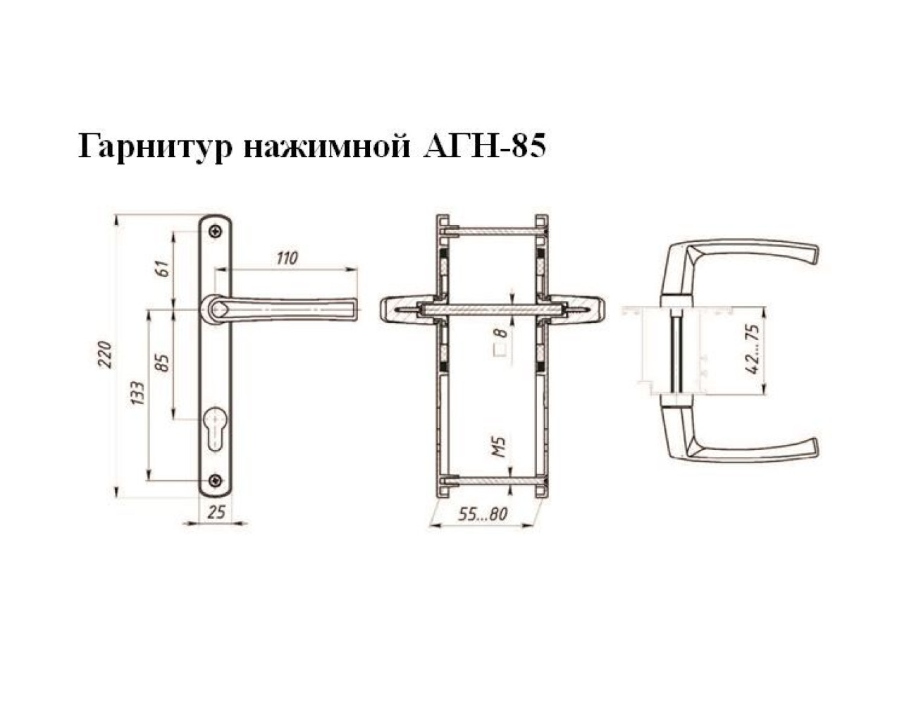 Нажимные гарнитуры предназначены для установки на алюминиевые, пластиковые, стальные и деревянные двери. Крепление на двери - сквозное винтовое. Толщина профиля 67-76 мм. Совместимы с замками KALE, KFV, GU и другими. Покрытие - ППМ по каталогу RAL. Нажимной гарнитур подпружиненный с межосевым расстоянием 85 мм с планкой 25 мм. Артикул с (.02) - НГ с ручкой "под пальчики".