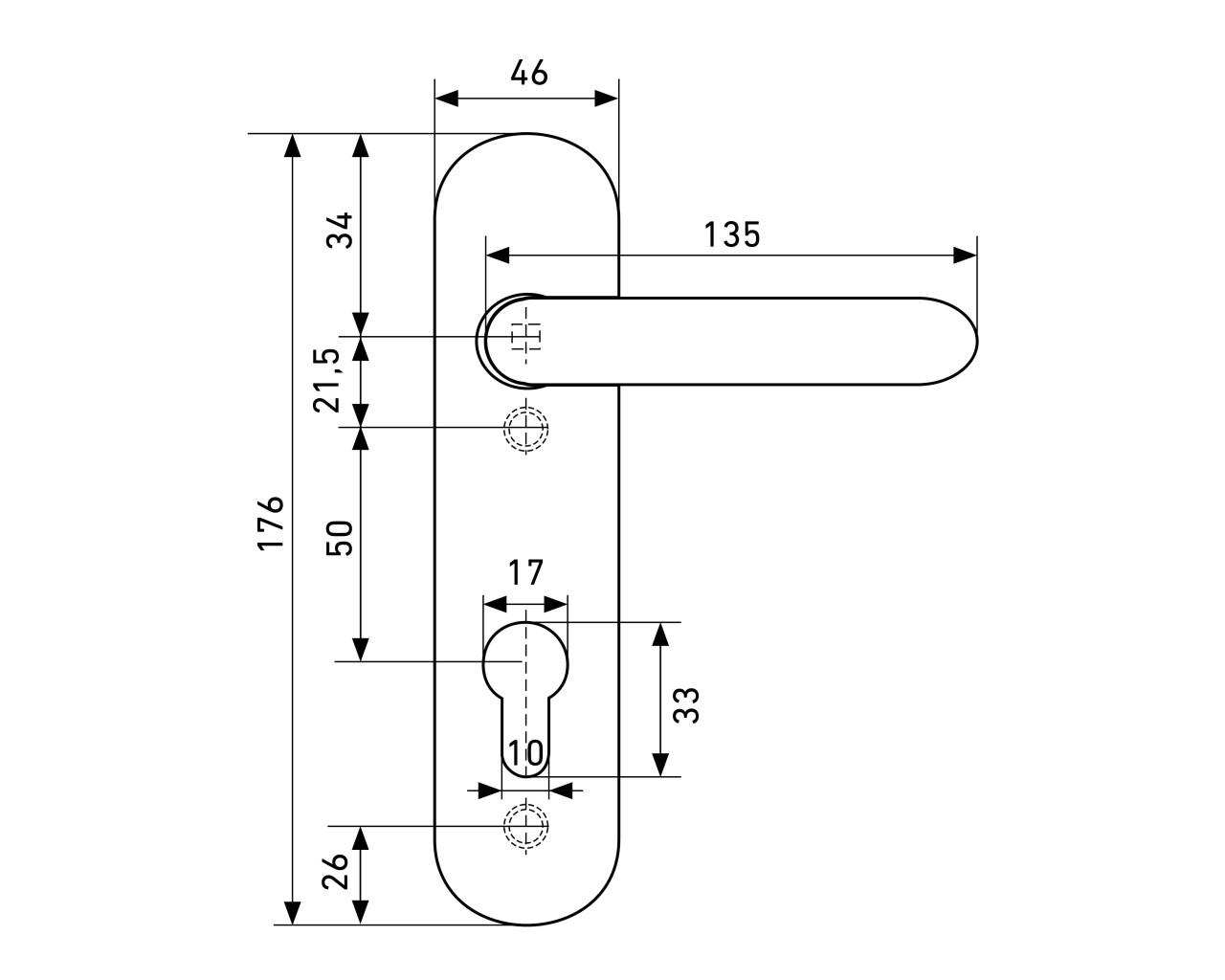 Ручка на планке подпружиненная под цилиндровый механизм. Материал планки - сталь, ручки - пластик с добавлением антипирена для снижения горючести. Межосевое расстояние - 72 мм, размеры планки - 46х176 мм. В комплект входят 2 винтовые стяжки, квадрат со стороной 9мм, 2 пружины., крепеж.