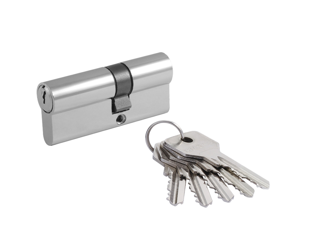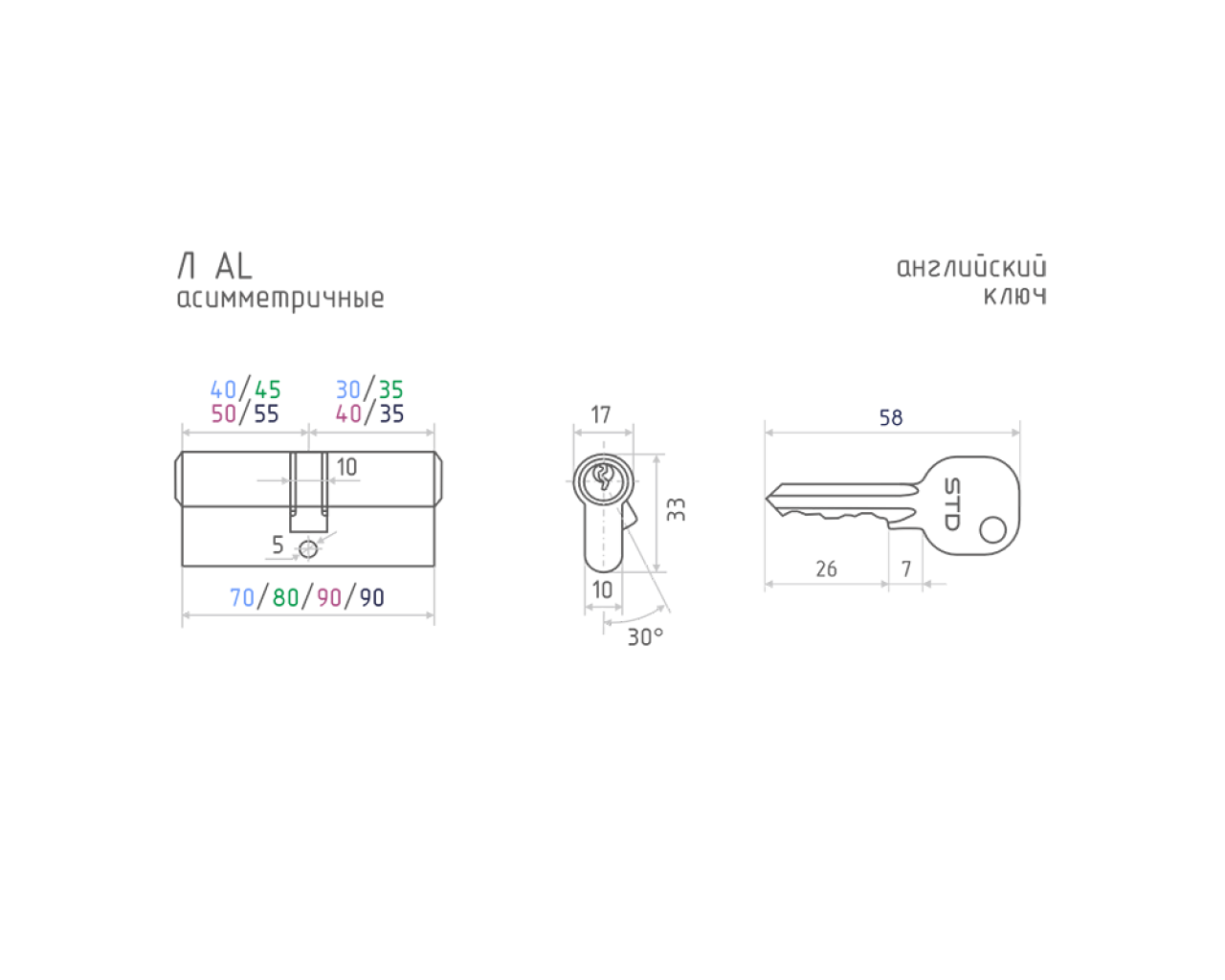 Цилиндр для межкомнатных и входных дверей бюджетной серии STD Материал алюминий сердечник ЦАМ В комплекте 5 стальных английских ключей 5 пинов Обратите внимание - цилиндр асимметричный то есть имеет разное соотношение сторон по длине относительно центра Длину цилиндра подбирайте исходя из толщины двери с небольшим запасом под накладку