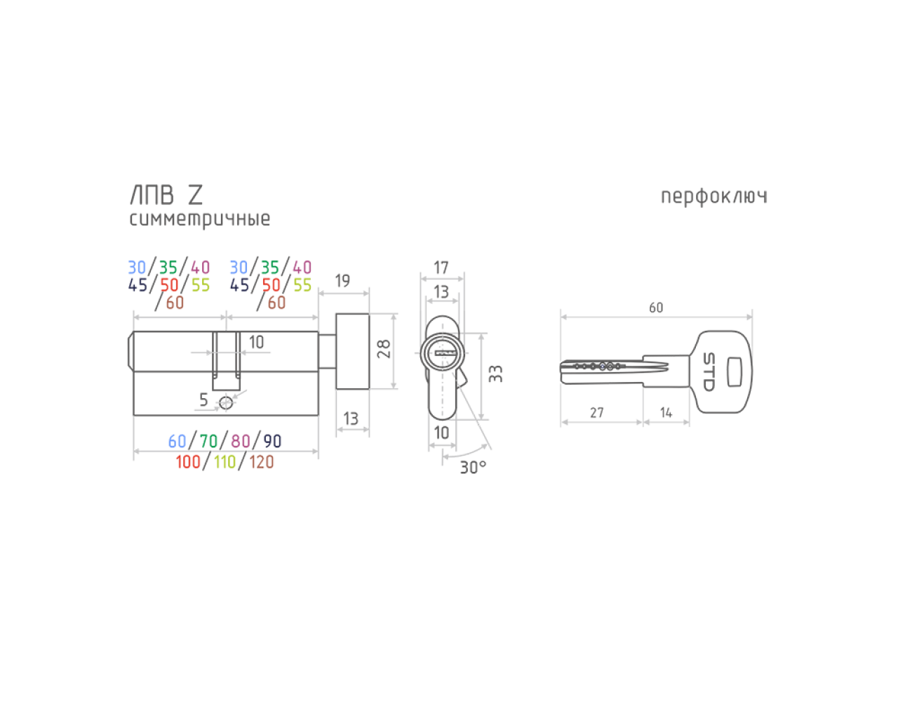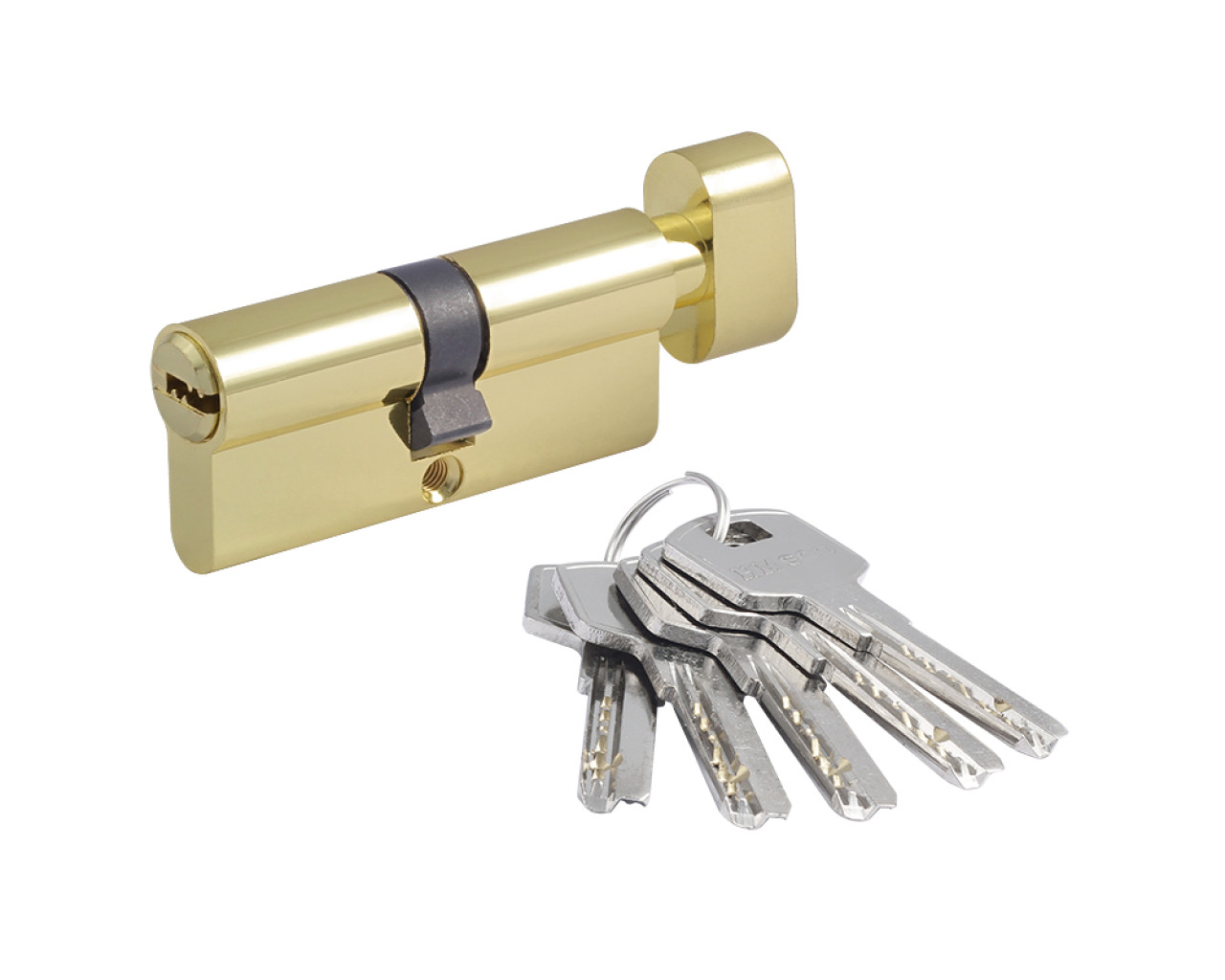 Цилиндр для межкомнатных и входных дверей Материал ЦАМ сплав цинка алюминия и меди В комплекте 5 стальных перфорированных ключей 5-6 пинов в зависимости от размера Цилиндр имеет вертушку для удобного запирания изнутри помещения без использования ключа Длину цилиндра подбирайте исходя из толщины двери с небольшим запасом под накладку