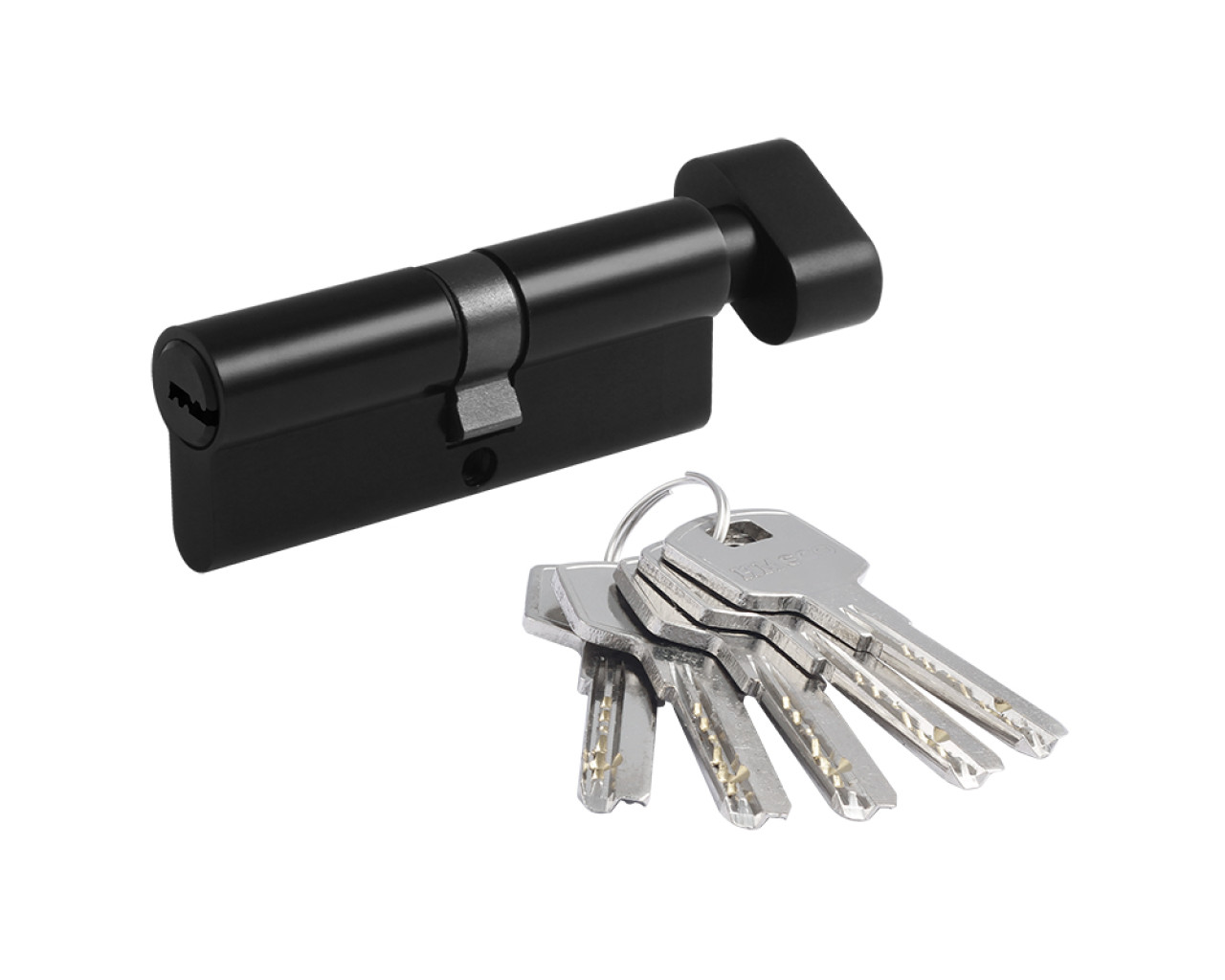Цилиндр для межкомнатных и входных дверей Материал ЦАМ сплав цинка алюминия и меди В комплекте 5 стальных перфорированных ключей 5-6 пинов в зависимости от размера Цилиндр имеет вертушку для удобного запирания изнутри помещения без использования ключа Длину цилиндра подбирайте исходя из толщины двери с небольшим запасом под накладку