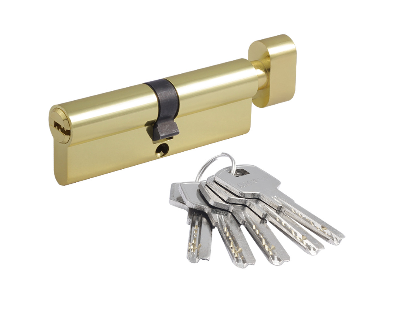 Цилиндр для межкомнатных и входных дверей Материал ЦАМ сплав цинка алюминия и меди В комплекте 5 стальных перфорированных ключей 5-6 пинов в зависимости от размера Цилиндр имеет вертушку для удобного запирания изнутри помещения без использования ключа Длину цилиндра подбирайте исходя из толщины двери с небольшим запасом под накладку
