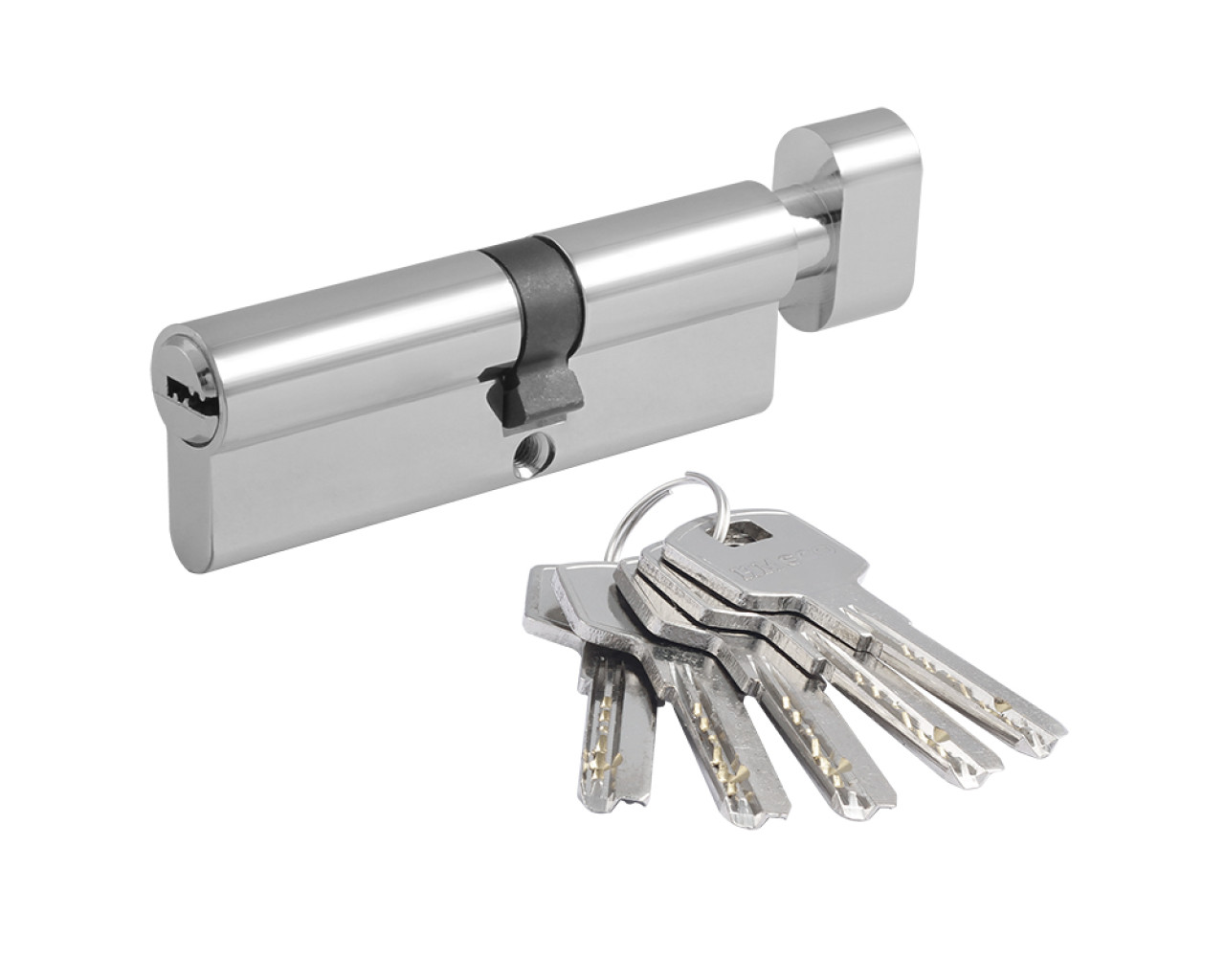 Цилиндр для межкомнатных и входных дверей Материал ЦАМ сплав цинка алюминия и меди В комплекте 5 стальных перфорированных ключей 5 пинов Цилиндр имеет вертушку для удобного запирания изнутри помещения без использования ключа Обратите внимание - цилиндр асимметричный то есть имеет разное соотношение сторон по длине относительно центра Длину цилиндра подбирайте исходя из толщины двери с небольшим запасом под накладку