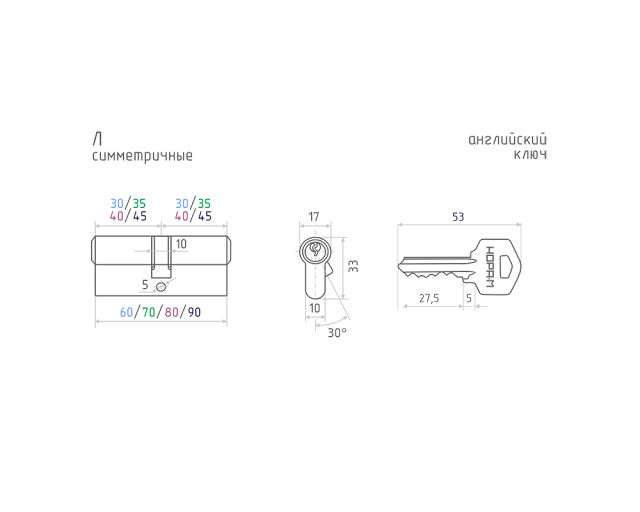 Нора М Цилиндр. механизм Л-60 (30*30) хром англ кл/ключ 5к 4606555009763