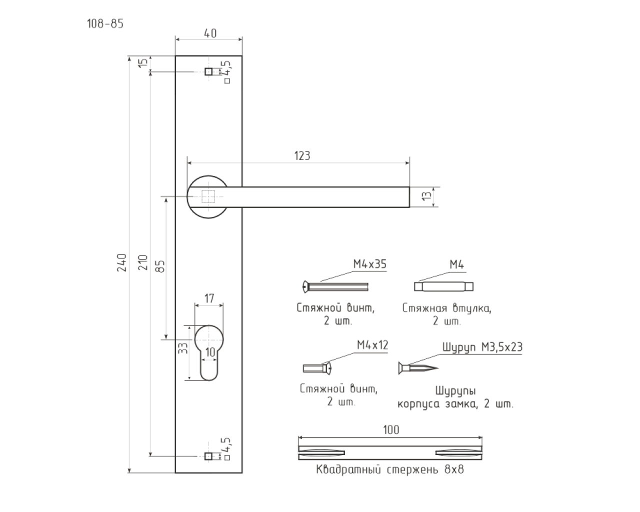 Комплект ручек на планке 2 шт модели 108-85 предназначен для комплектации с корпусом замка под цилиндр с межосевым расстоянием 85мм В упаковке 2 ручки на планке крепежРучки универсальные могут быть установлены на двери левого и правого открыванияМатериал ручки - сплав алюминия алюминий и кремний материал планки - сталь Механизм - усиленная пружина с повышенным ресурсом работы из закаленной сталиПокрытие ручки и планки - многослойное гальваническое