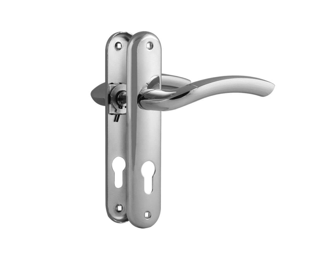Дверная ручка на планке модели 23-70мм предназначена для комплектации корпусов замков с межосевым расстоянием 70 мм Модификация - под евроцилиндр Гальваническое многослойное покрытие