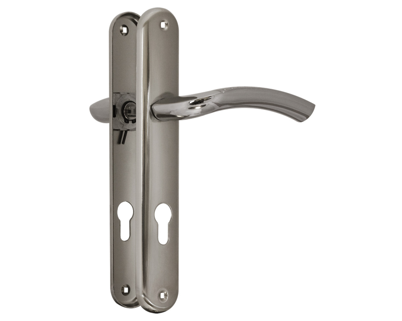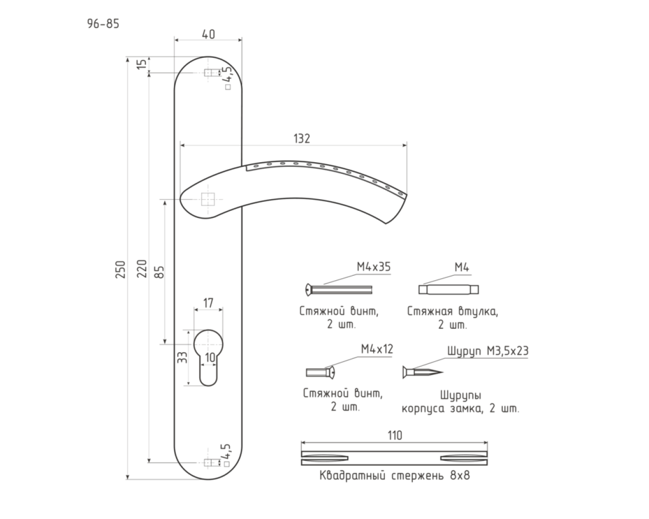 Ручка для дверей 96-85мм выполнена на планке с отверстием под цилиндровый механизм это позволяет комплектовать данную ручку и корпус замка без дополнительных дверных накладок Ручка выполнена из сплава алюминия алюминий кремний для прочности Планка - из стали Покрыта гальваническим способом в 5 слоев Ручка поставляется в индивидуальной фирменной картонной коробке В комплекте - стяжные винты